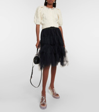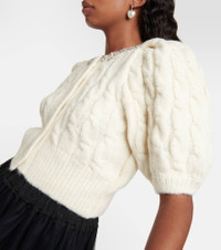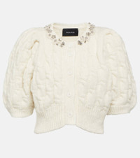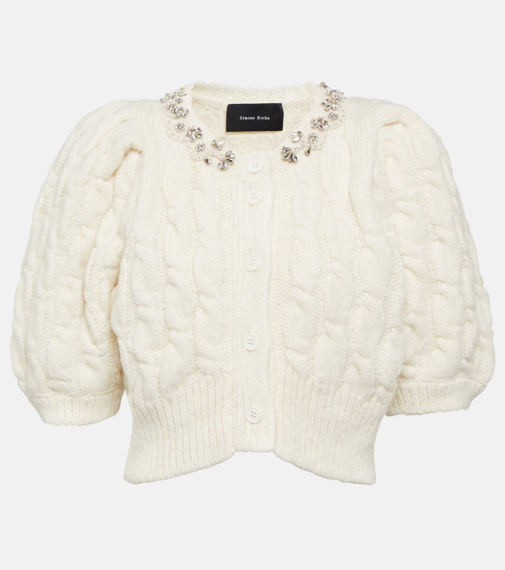 A mainstay at London Fashion Week, Simone Rocha's artful aesthetic is a subversive take on romance and femininity. This cable-knit cardigan is crafted from a warm wool blend with an embellished collar and balloon sleeves. Product Details - Care instructions: hand wash - Made in Portugal - Material: 22% polyamide, 23% wool, 55% alpaca wool - Designer color name: Ivory/Pearl/Clear - Closure: buttoned front - Item number: P00851338 Size & Fit - True to size - Oversized shoulders - Cinched waist - Mid-weight material - Cropped - The model seen in the picture is 178cm-5'10" and wearing a size XS