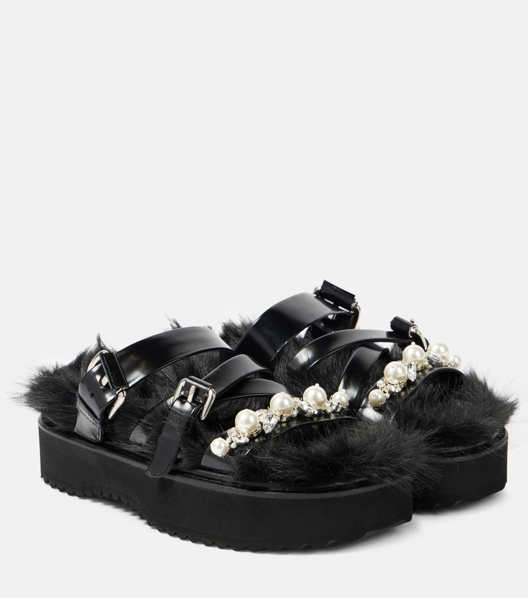 Faux fur-trimmed leather platform sandals
