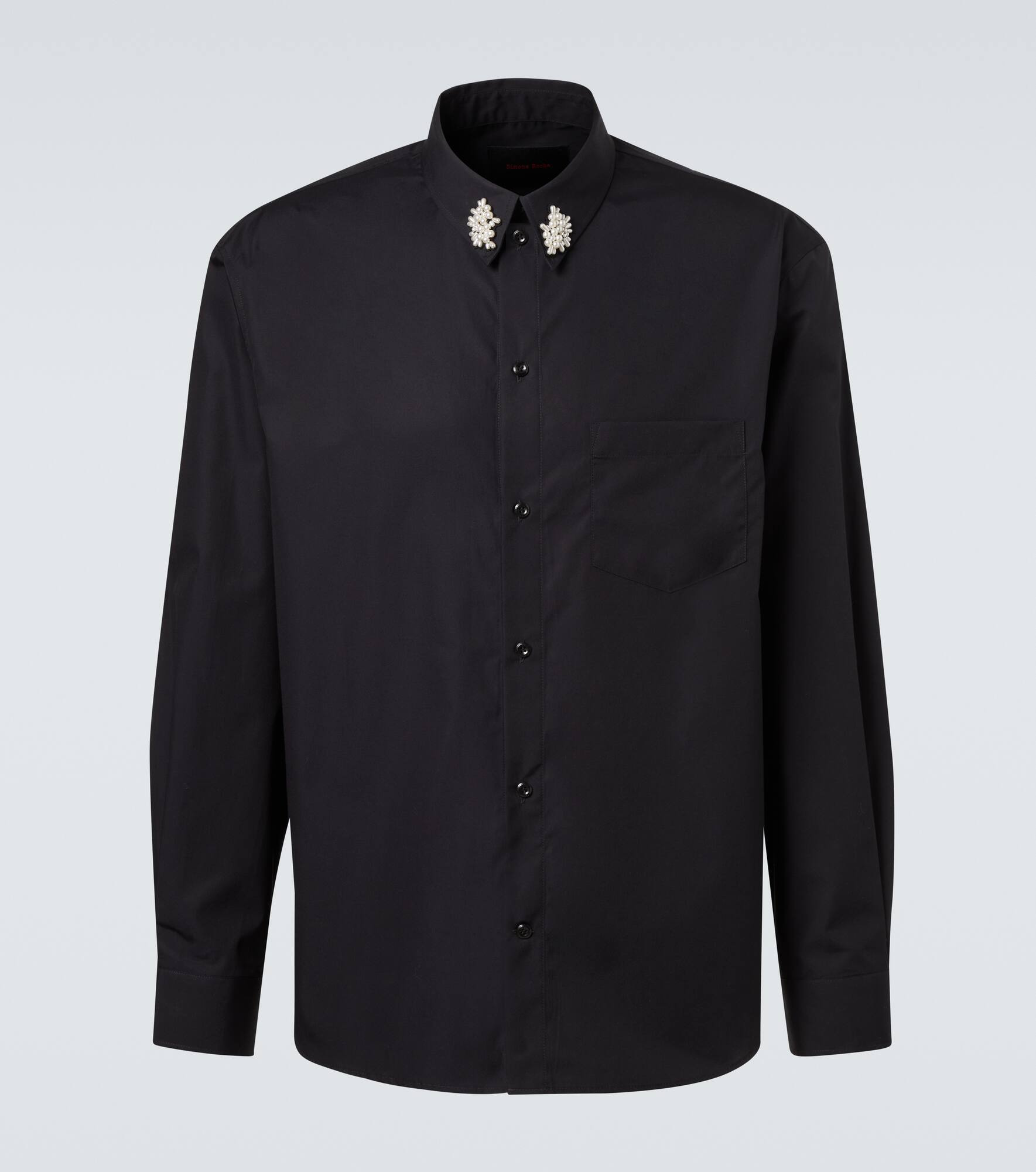This shirt from Simone Rocha is made from crisp cotton poplin and designed for a regular fit. The style is finished with clusters of faux-pearl embellishments at the collar. Product Details - Material: 100% cotton - Care instructions: hand wash - Made in Portugal - Designer color name: Black/Pearl2 - Item color: black - Collar: classic (Straight point) - Closure: buttoned placket - Pockets: angled chest pocket - Cuff: two buttons - Item number: P01064453 Size & Fit - True to size - Dropped shoulders - With pleats in the back - Classic fit - Non-stretchy fabric - Falls below the hip - Height of model is 188cm-74" and wears a size L