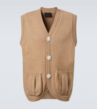Simone Rocha captivates the world with its ability to blend artistry and design. Knit from a warming wool-blend, this vest features pleated patch pockets and faux pearl-embellished buttons. Product Details - Material: 93% wool (merino wool), 6% polyamide, 1% elastane - Care instructions: hand wash - Made in Portugal - Designer color name: Camel/Pearl - Item color: beige - Closure: snap-buttoned front - Hem: ribbed - Pockets: patch pockets - Item number: P01064456 Size & Fit - True to size - Straight fit - Slightly stretchy fabric - Falls below the hip - The model in the picture is 185cm-6'1" and wearing a size L