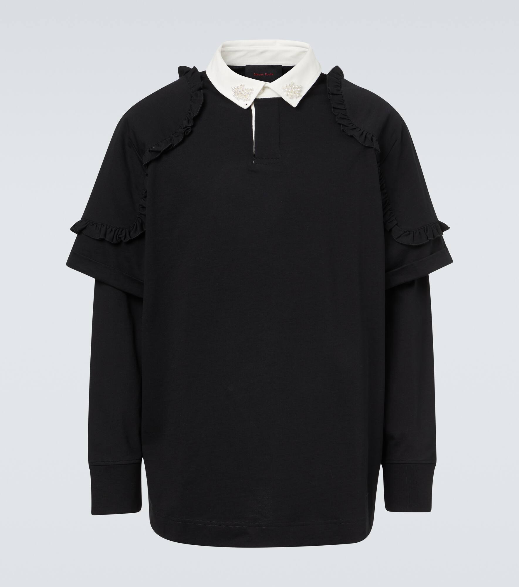 This polo shirt from Simone Rocha is structured with a layered design, overlapping short and long sleeves, and including an embellished classic collar. Crafted from pure cotton jersey, the style features ruffled detailing and a relaxed silhouette. Product Details - Material: 100% cotton - Care instructions: dry clean - Made in Portugal - Designer color name: Black\Pearl - Item color: black, white - Material II: 100% cotton - Insert: 100% polyamide - Material III: 95% polyester, 5% polyamide - Collar: polo collar - Closure: concealed button placket - Side slits - Item number: P01064458 Size & Fit - Fits large to size - we recommend trying one size smaller - Designed for a loose fit - Slightly stretchy fabric - Falls below the hip - Height of model is 188cm-74" and wears a size L