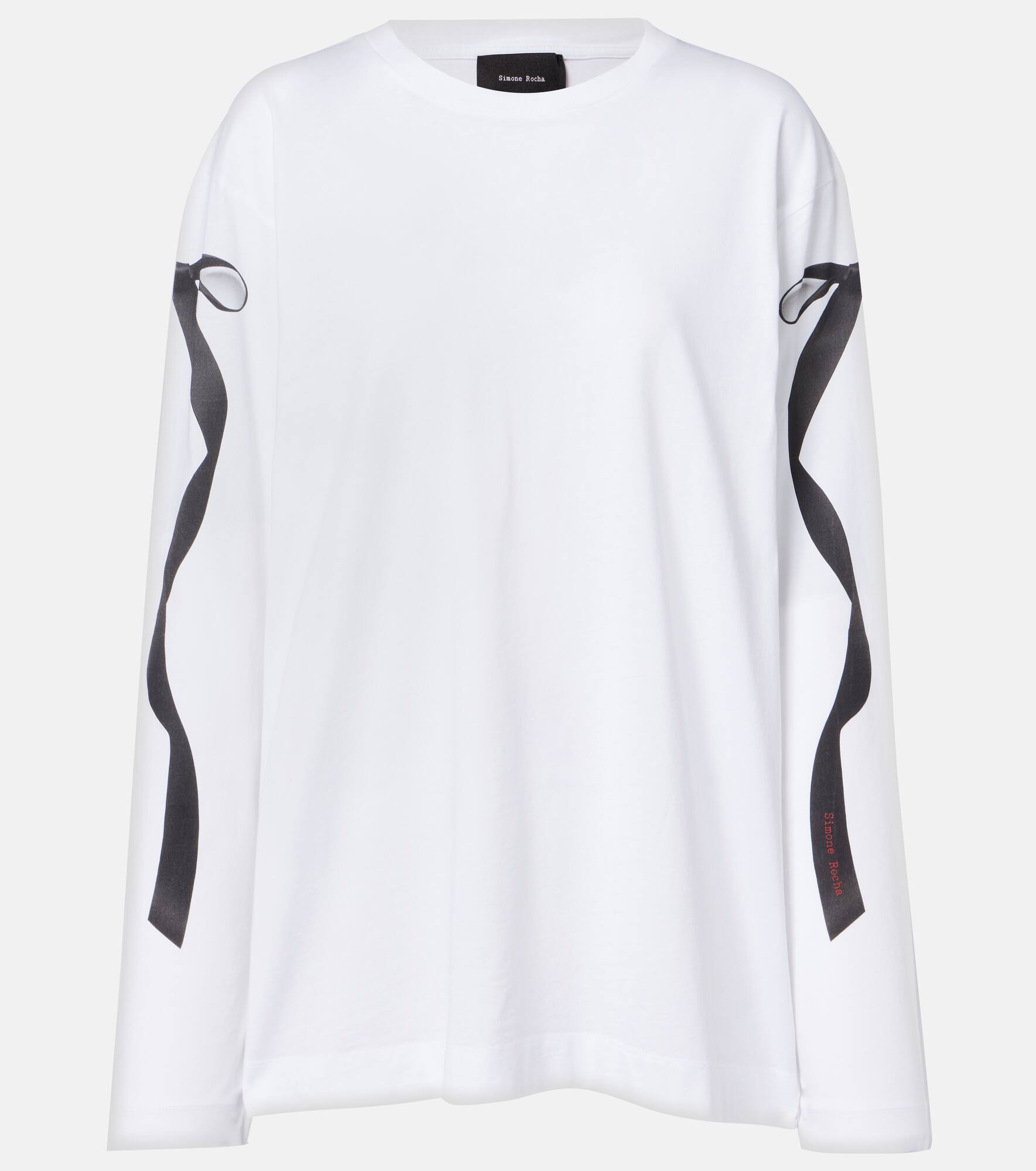 Crafted in Portugal from soft cotton jersey, this Simone Rocha T-shirt features long sleeves and a classic crewneck. Ribbon-printed details run along the sleeves, adding a subtle nod to the brand’s romantic aesthetic. Product Details - Material: 100% cotton - Care instructions: machine wash at 40 degrees - Made in Portugal - Designer color name: White/Black - Item color: white, black - Collar: crewneck - Sleeves: long-sleeved - Item number: P01074261 Size & Fit - Fits large to size - we recommend trying one size smaller - Designed for a loose fit - Slightly stretchy fabric - Falls below the hip - The model seen in the picture is 178cm-5'10" and wearing a size XS
