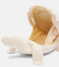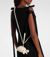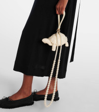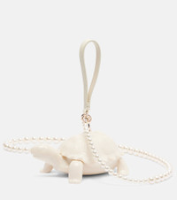 A mainstay at London Fashion Week, Simone Rocha's artful aesthetic is a subversive take on romance and femininity. The striking Tortoise clutch features a magnetic shell closure and detachable faux pearl strap that can be worn crossbody or as a wristlet. Product Details - Material: acrylic - Lining: fabric - Made in China - Designer color name: Cream - Item color: white - Hardware color: silver - Trim: calf leather, acrylic - Detachable shoulder strap - Internal details: single compartment - Closure: magnetic fastening - Item number: P01082312 Size & Fit - Length 18,5cm-7.5" - Width 12cm-4.5" - Depth 8cm-3" - Length of handle 28cm-11" - Length shoulder strap 118cm-46.5"