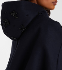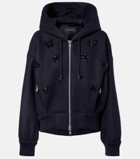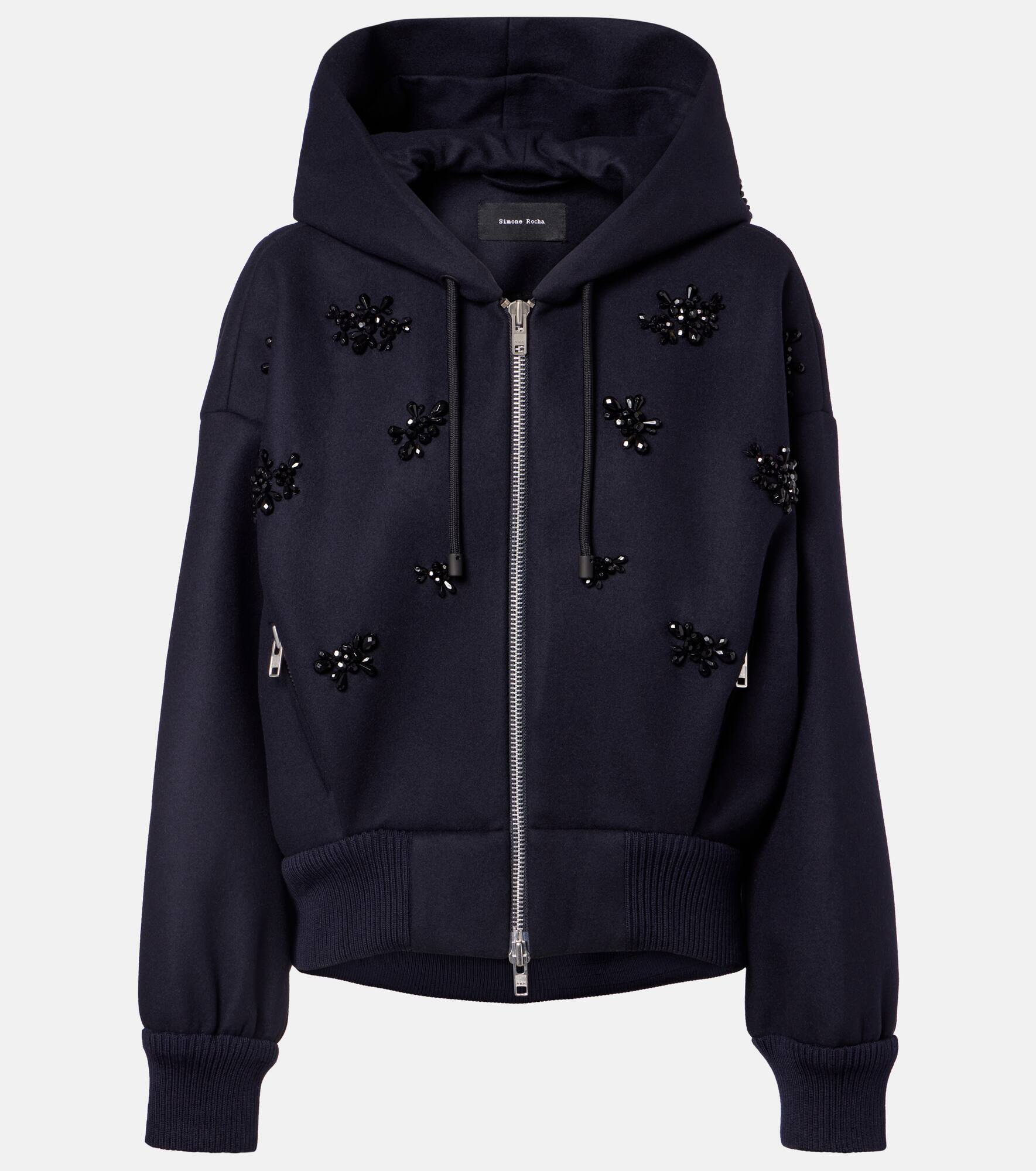 A mainstay at London Fashion Week, Simone Rocha's artful aesthetic is a subversive take on romance. The Turbo zip-up hoodie is made from a wool blend to a boxy, slightly cropped silhouette and boasts clusters of shimmering embellishments. Product Details - Material: 50% wool, 25% polyester, 13% polyamide, 12% polyurethane - Care instructions: dry clean - Made in Portugal - Designer color name: Navy/Jet - Item color: blue - Lining: 75% wool, 20% polyamide, 5% cashmere - Trim: 100% wool (merino wool) - Hardware color: silver - Closure: two-way zipped front - Pockets: zipped pockets - Drawstring hood - Cuff: ribbed - Hem: ribbed - Item number: P01074233 Size & Fit - Fits large to size - we recommend trying one size smaller - Dropped shoulders - Designed for a loose fit - Elasticated hem - Non-stretchy fabric - Falls to the hip - The model seen in the picture is 178cm-5'10" and wearing a size UK 6
