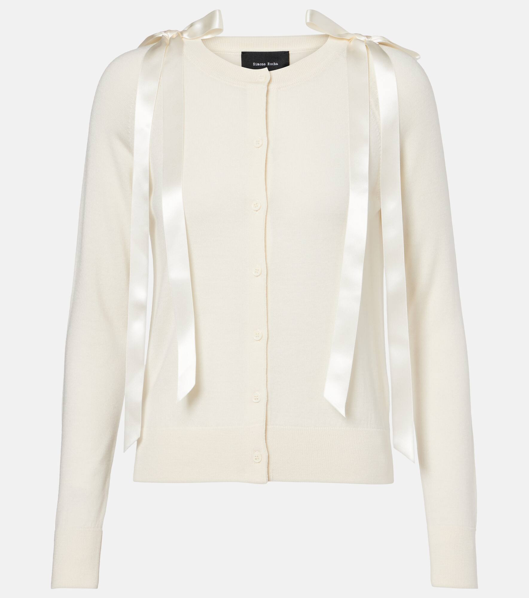 A mainstay at London Fashion Week, Simone Rocha's artful aesthetic is a subversive take on romance and femininity. This wool and silk cardigan feature ribbon embellishments and ribbed-trims. Product Details - Material: 70% wool (merino wool), 30% silk - Care instructions: dry clean - Made in Portugal - Designer color name: Ivory - Item color: white - Material II: 100% polyester - Cuff: ribbed - Closure: buttoned front - Hem: ribbed - Item number: P01112216 Size & Fit - True to size - Cinched waist - Stretchy fabric - Falls to the hip - The model seen in the picture is 178cm-5'10" and wearing a size XS