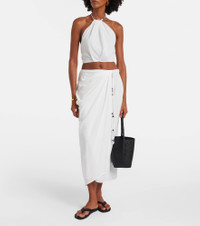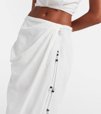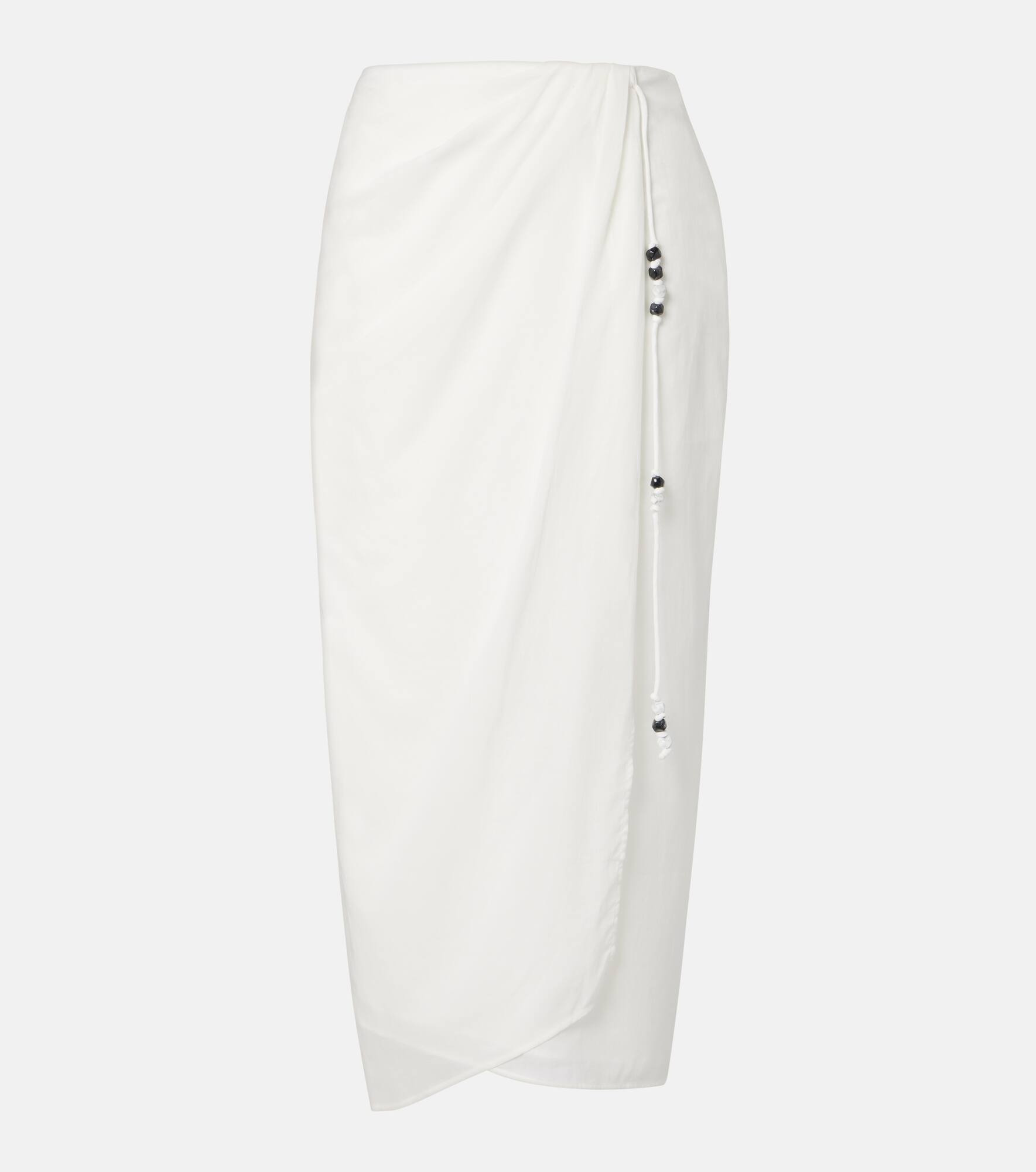 The Azura wrap skirt by SIR is cut from pure cotton to a midi silhouette, offering a lightweight texture. Its design comes with a high-rise waistline that features removable strings adorned with marble-effect beading. Product Details - Material: 100% cotton - Care instructions: dry clean - Handmade in China - Designer color name: Ivory - Item color: white - Lining: 100% cotton - Details: 100% resin - Closure: zipped side, belted waist - Fully lined - Item number: P01074189 Size & Fit - True to size - Elasticated waist - Non-stretchy fabric - The model seen in the picture is 178cm-5'10" and wearing a size 1