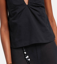 The Azura cotton top by SIR features an open back and a gathered front with a flattering V-neckline. Its design comes with a halterneck, and the thin straps are adorned with the signature beads. Product Details - Material: 100% cotton - Care instructions: dry clean - Handmade in China - Designer color name: Black - Item color: black - Lining: 100% cotton - Details: 100% resin - Self-tie neck - Elasticated waistband - Fully lined - Item number: P01074279 Size & Fit - True to size - Low back - Cinched waist - Elasticated waist - Non-stretchy fabric - Falls to the hip - The model seen in the picture is 178cm-5'10" and wearing a size 1