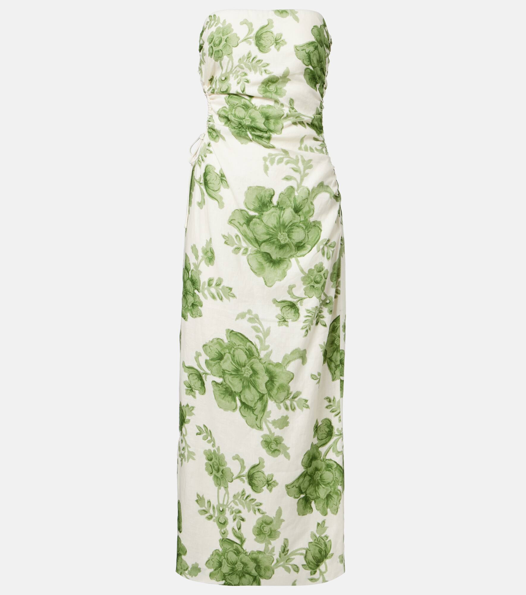 Create effortlessly charming ensembles around pieces like the Gardella midi dress from SIR. Made from breathable linen, the strapless style is complete with a floral pattern and a cutout on the side. Product Details - Material: 100% linen - Care instructions: dry clean - Handmade in China - Designer color name: Frisa Print - Item color: white, green - Lining: 100% cotton - Closure: zipped side, drawstring - Long vent - Fully lined - Item number: P01100621 Size & Fit - True to size - Strapless - Fitted - Non-stretchy fabric - The model seen in the picture is 178cm-5'10" and wearing a size 1
