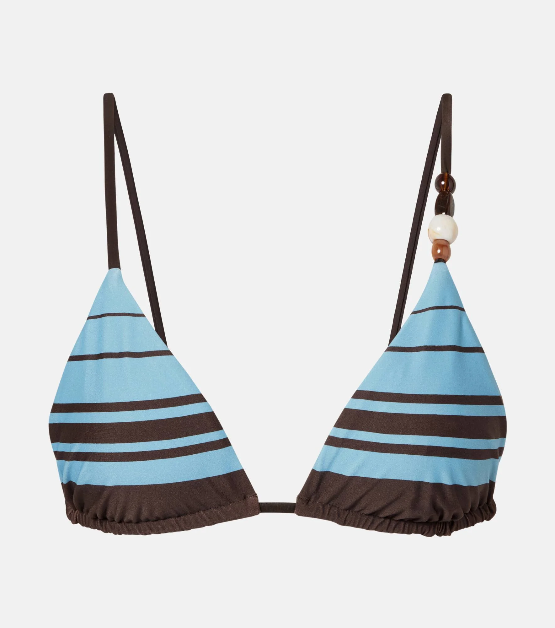 The Rioja bikini top from SIR is presented in the classic triangle silhouette. This design is defined by contrast striped detailing, a cluster of beads on one side, and adjustable ties on the back. Product Details - Material: 76% nylon, 24% elastane - Care instructions: hand wash - Made in China - Designer color name: Pacha Mineral Stripe - Item color: blue, brown - Lining: 74% nylon, 26% elastane - Closure: self-ties - Item number: P01125312 Size & Fit - True to size - Unpadded Top - The model seen in the picture is 178cm-5'10", cup size B, and wearing a size 1