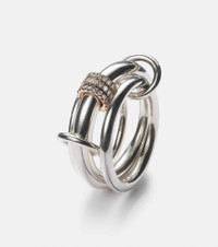 Spinelli Kilcollin's jewelry is handcrafted locally by a team of artisans in Los Angeles. The brand’s modern take on fine jewelry is expressed through the clean lines of the Gemini ring. Linked by two connectors, one band is adorned by three orbiting annulets, while the other two are decorated with pavé-set white diamonds. Wear yours as a conversation-starting piece to a gallery opening or dinner party. Product Details - Material: 925 sterling silver, 18kt rose gold, 18kt yellow gold - Made in the USA - Stone I: white diamonds, round-cut, pavé setting - Designer color name: Silver - Item number: P00715921 Size & Fit - Min. width 2mm-0.1" - Max. width 10mm-0.4"