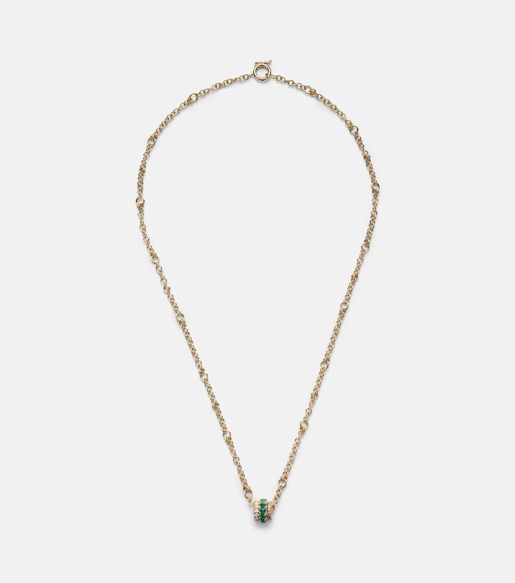 Product Details - Material: 18kt yellow gold - Made in the USA - Stone I: diamond, round-cut, pave setting - Stone I carat weight (ct): 1,13 - Stone II: emerald, round-cut, pave setting - Chain type: cable - Item number: P00949545 Size & Fit - Length when open 46cm-18" - Width 2mm-0.1" - Pendant length 9mm-0.35" - Pendant width 6mm-0.25"