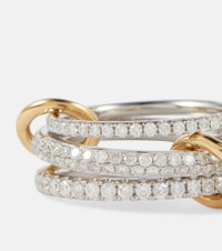 Spinelli Kilcollin's jewelry is handcrafted locally by a team of artisans in Los Angeles. In brand-signature style, the Nova ring features three sterling silver bands that can be styled layered or across several fingers. They’re connected with 18kt yellow gold connectors and encrusted with pavé-set white diamonds. Product Details - Material: 18kt yellow gold, 925 sterling silver - Made in the USA - Stone I: white diamonds, pavé setting, round-cut - Designer color name: Silver/Yellow Gold - Item number: P00752875 Size & Fit - Max. width 11mm-0.45"