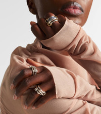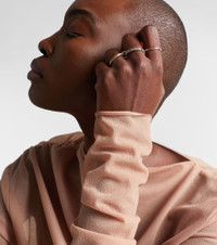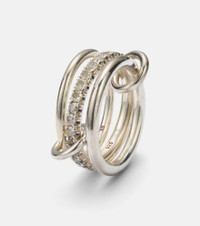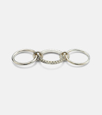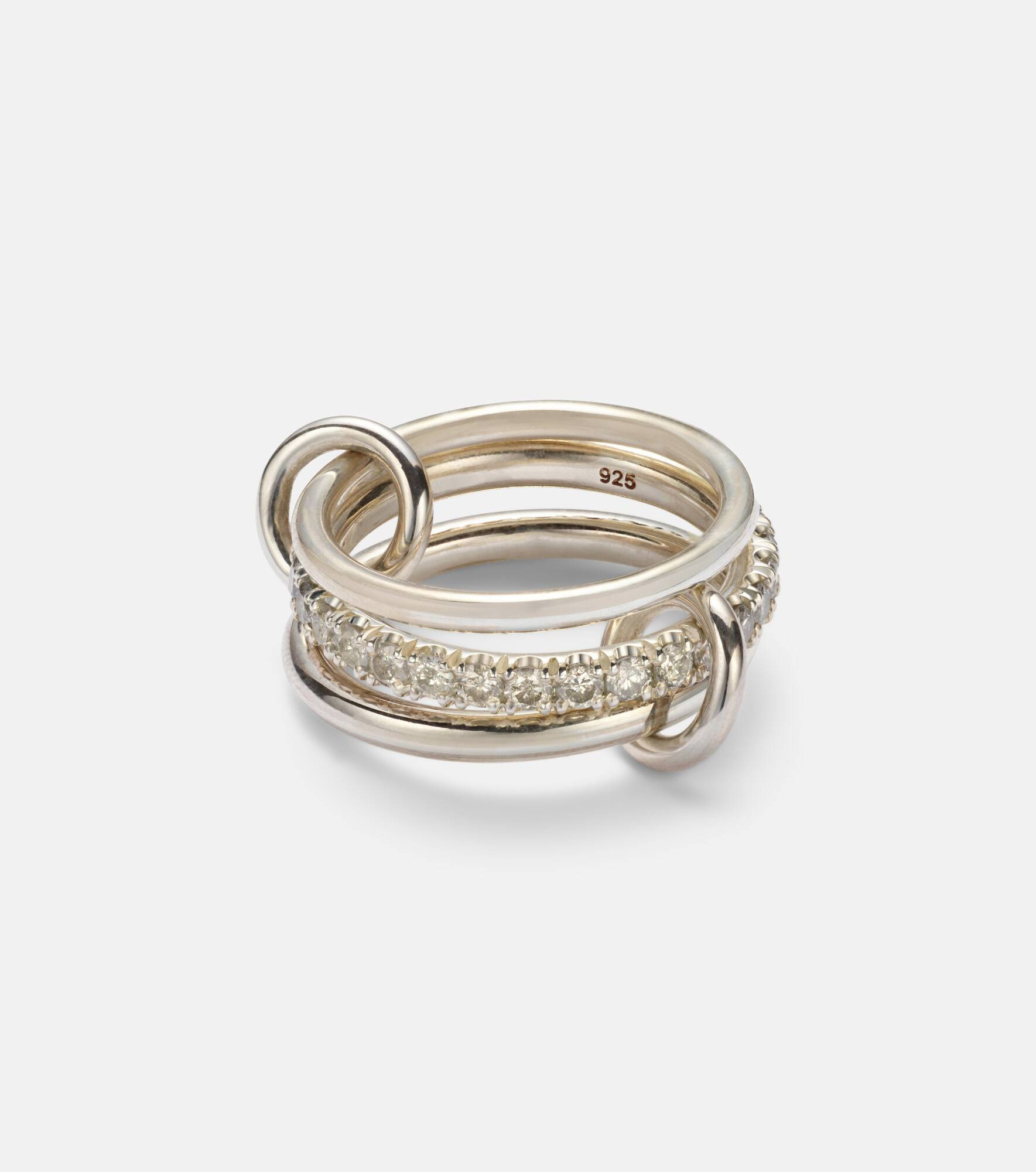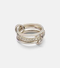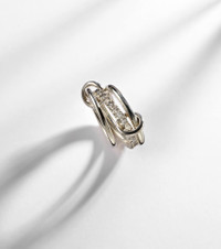 The Petunia ring from Spinelli Kilcollin offers a stacked look consisting of a central band featuring pave-set diamonds framed by two minimalist bands. Two ring connectors link the sterling silver bands together. Product Details - Material: 925 sterling silver - Handmade in the USA - Item color: silver - Stone I: 28 diamonds, G color grade, VS1 clarity grade, pave setting, 1.4ctw - Item number: P01071835 Size & Fit - Max. width 12mm-0.45"