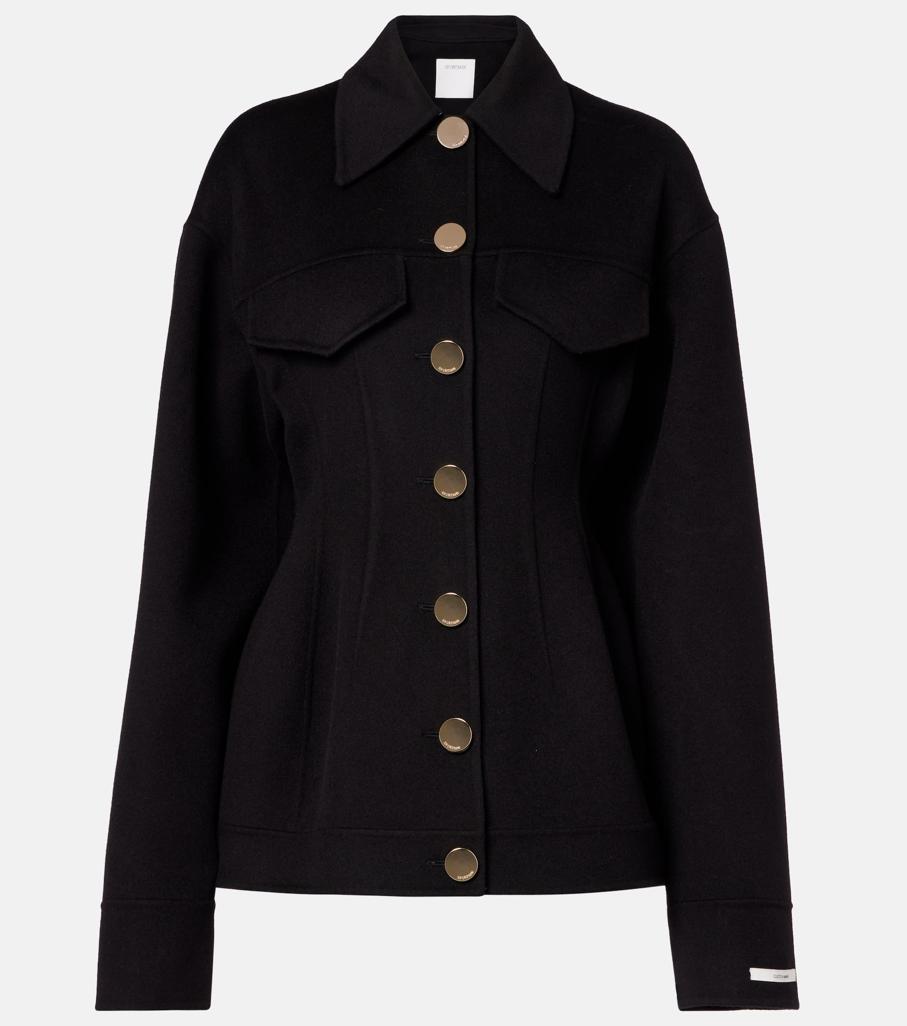 Founded on the principles of tailoring and experimentation, Sportmax combines a contemporary urban spirit with sportswear-inspired silhouettes. The Egeo jacket is cut from virgin wool fabric to a precise, figure-hugging silhouette with oversized metallic buttons. Product Details - Material: 100% virgin wool - Care instructions: dry clean - Made in China - Designer color name: Nero - Item color: black - Hardware color: gold - Closure: buttoned front - Pockets: faux pockets - Item number: P01078974 Size & Fit - True to size - Dropped shoulders - Cinched waist - Non-stretchy fabric - Falls below the hip - The model seen in the picture is 178cm-5'10" and wearing a size DE 34