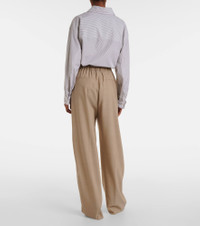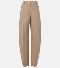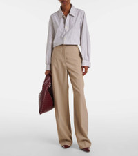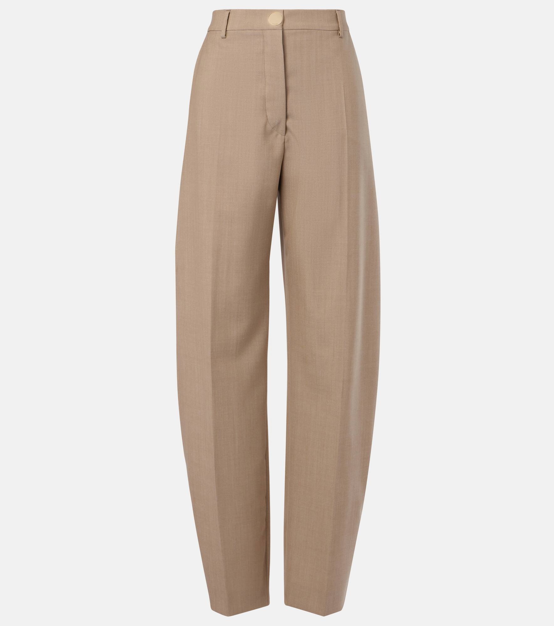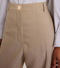 Founded on the principles of tailoring and experimentation, Sportmax combines a contemporary urban spirit with sportswear-inspired silhouettes: case in point, the Salvo pants. Crafted from virgin wool, this style is shaped to a wide-leg silhouette with flattering front pleats. Product Details - Material: 100% virgin wool - Care instructions: dry clean - Made in Poland - Designer color name: Beige Melange - Item color: beige - Hardware color: gold - Closure: concealed button placket, snap-buttoned fastenings - Pockets: slant pockets, welt pockets - Elasticated waistband - Belt loops - Single pleat - Item number: P01078980 Size & Fit - True to size - Elasticated waist - Non-stretchy fabric - Wide-leg - High-waisted - The model seen in the picture is 178cm-5'10" and wearing a size DE 34