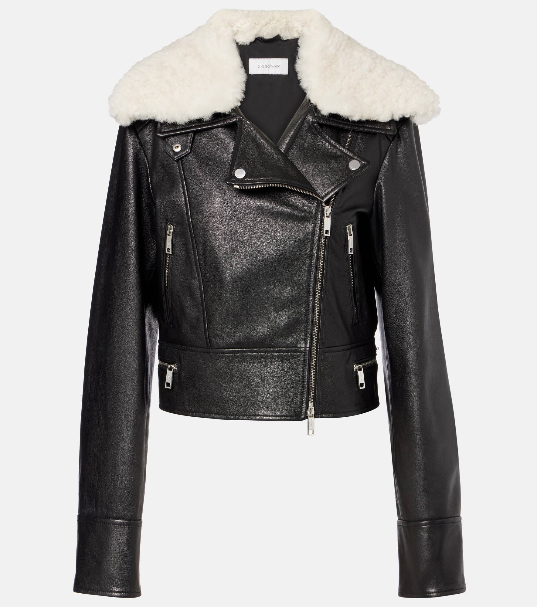 Founded on the principles of tailoring and experimentation, Sportmax combines a contemporary urban spirit with sportswear-inspired silhouettes. Crafted from supple goat leather, the Toscana jacket features a slightly cropped, straight silhouette with a detachable shearling collar. Product Details - Material: 100% goat leather - Care instructions: specialist clean - Made in India - Designer color name: Nero - Item color: black - Hardware color: silver - Lining: 97% polyester, 3% elastane - Details: 100% shearling - Closure: two-way zipped front - Pockets: zipped pockets - Detachable collar - Cuff: zipped - Item number: P01094337 Size & Fit - True to size - Straight fit - Non-stretchy fabric - Slightly cropped - The model seen in the picture is 178cm-5'10" and wearing a size DE 34