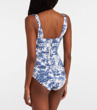 The Adelaide swimsuit by Staud brings elevated style and elegance to swimwear. Featuring a corset-inspired design, this one-piece showcases a charming print, supportive straps and a back zip closure for a secure fit. Product Details - Material: 67% polyester (recycled), 33% elastane - Care instructions: hand wash - Made in Vietnam - Designer color name: Blue Toile - Item color: blue, white - Trim: 80% nylon, 20% elastane - Closure: zipped back - Item number: P01074616 Size & Fit - True to size - Internal boned corset for support - Unpadded Top - Medium-cut leg - The model seen in the picture is 178cm-5'10", cup size B, and wearing a size XS