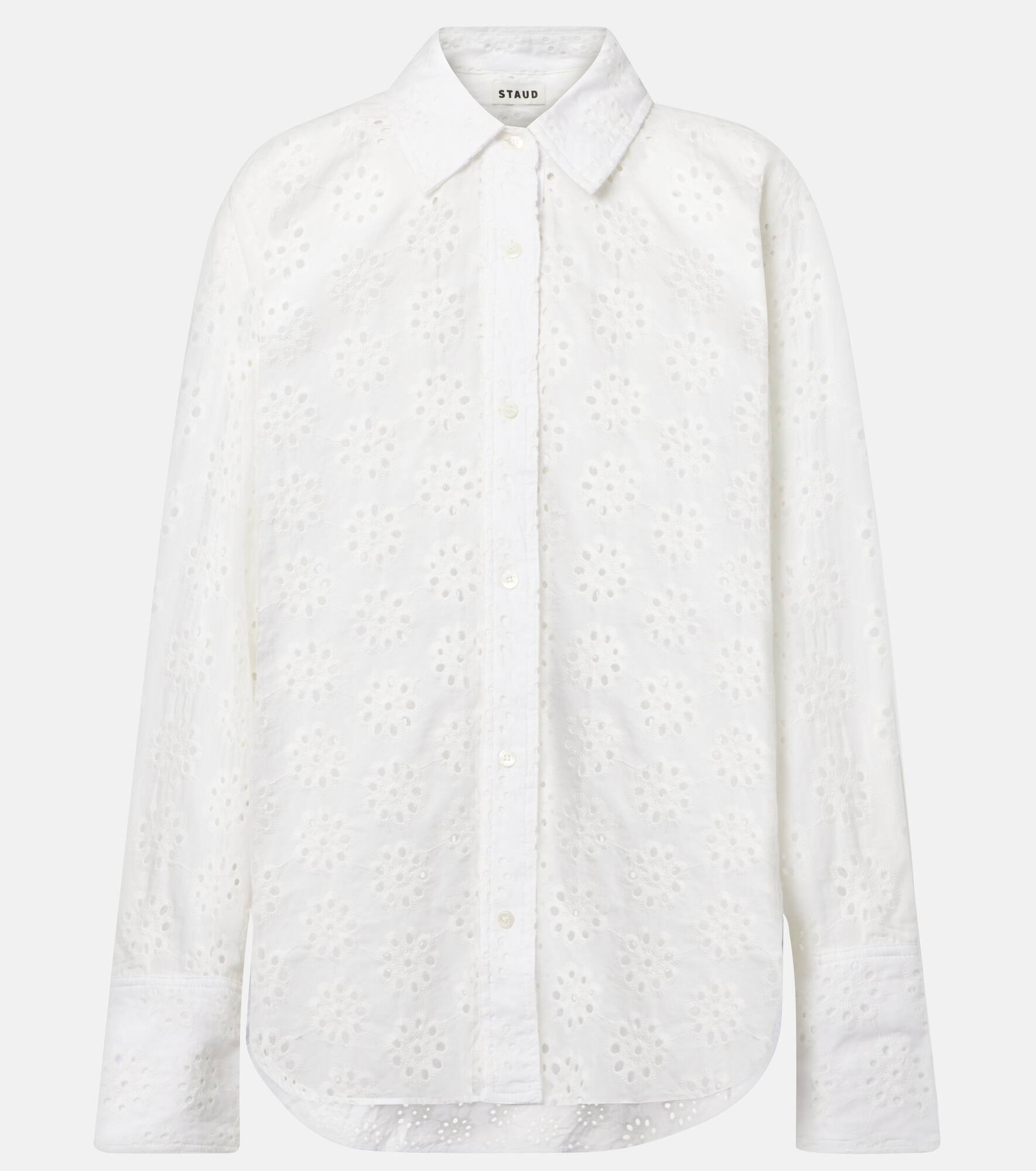 Staud's Colton shirt captures the essence of summer with its breezy silhouette. Crafted from cotton, detailed with eyelets, this style is ideal for layering or for wearing solo. Product Details - Material: 100% cotton - Care instructions: machine wash cold - Made in China - Designer color name: White Eyelet - Item color: white - Collar: classic (Straight point) - Closure: buttoned front - Cuff: two buttons - Lining: 100% cotton - Hem: uneven - Item number: P01074649 Size & Fit - True to size - Dropped shoulders - Semi-sheer - Designed for a loose fit - Non-stretchy fabric - Falls below the hip - The model seen in the picture is 178cm-5'10" and wearing a size XS