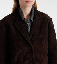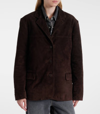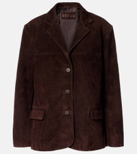 The Corrine jacket from Staud deserves a spot in your outerwear rotation. Versatile and refined, this blazer-inspired style is meticulously made from suede and comes in a single-breasted silhouette accented by flap pockets and notched lapels. Product Details - Material: 100% calf leather (suede) - Care instructions: specialist clean - Made in India - Designer color name: Espresso - Item color: brown - Lining: 100% polyester - Closure: single-breasted (three buttons) - Pockets: breast pocket, flap pockets, internal pocket - Notched lapel - Cuff: three buttons - Vent: double - Fully lined - Item number: P01074606 Size & Fit - True to size - Oversized shoulders - Shoulder pad inserts - Oversized - Non-stretchy fabric - Falls below the hip - The model seen in the picture is 178cm-5'10" and wearing a size XS