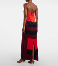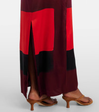 Staud seeks to break through repetition in design with thoughtful styles that are empowering and accessible. The Mae maxi dress is crafted from a colorblocked silk blend. Product Details - Material: 93% silk, 7% elastane - Care instructions: dry clean - Made in China - Designer color name: Ruby Prism - Item color: burgundy, brown, orange - Lining: 100% polyester - Closure: concealed zipper, zipped back, hook-fastening back - Long vent - Item number: P01098523 Size & Fit - Fits large to size - we recommend trying one size smaller - Low back - Straight fit - Non-stretchy fabric - slit length 49cm-19.5" - The model seen in the picture is 178cm-5'10" and wearing a size US 2