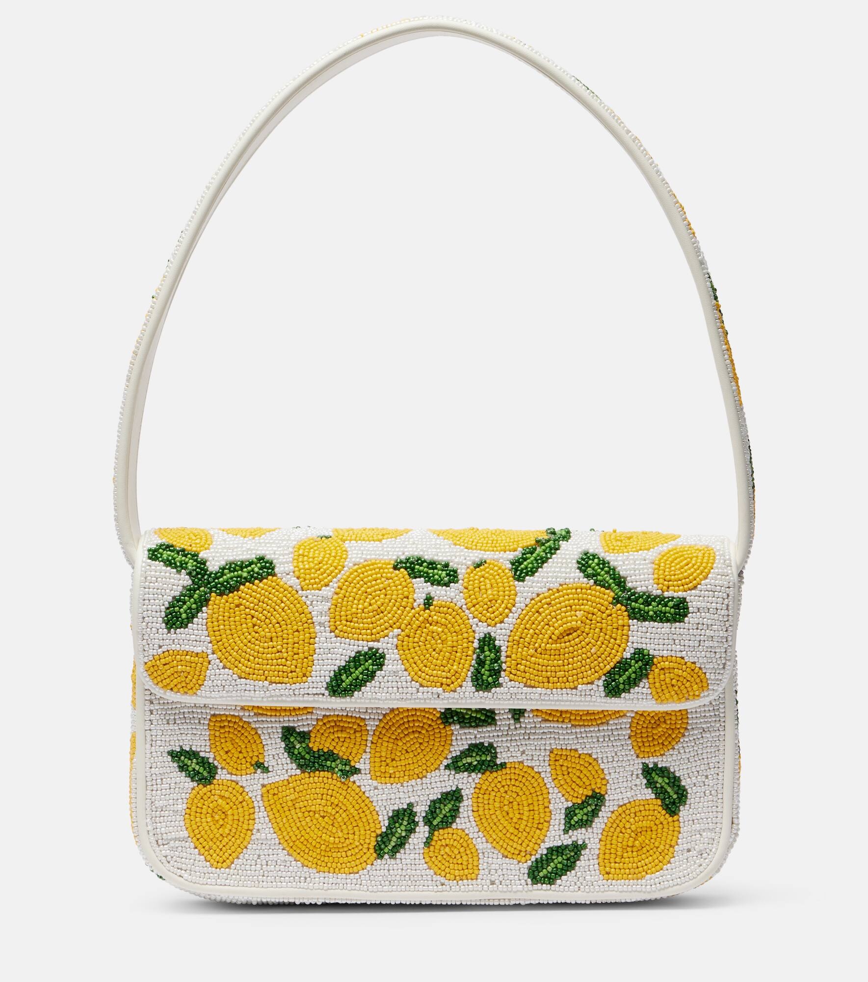 Let Staud be your go-to for standout accessories with designs like the Tommy shoulder bag. This piece is covered in glass beads and features a vibrant, Italian-inspired pattern with refreshing lemon motifs. Product Details - Material: fabric - Lining: fabric - Made in India - Designer color name: Ello - Lemons - Item color: yellow, white - Trim: leather - Internal details: internal zipped pocket - Closure: magnetic fastening - Contains non-textile parts of animal origin - Includes: dust bag - Item number: P01042598 Size & Fit - Height 15,5cm-6" - Width 26cm-10" - Depth 4,5cm-2" - Length shoulder strap 61cm-24"
