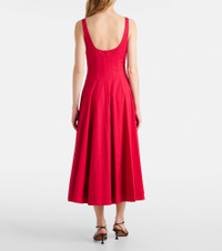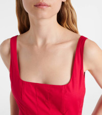 The Wells midi dress from Staud is a timeless piece that you'll love for seasons to come. Made from lightweight cotton poplin, the style is complete with a corset-inspired panel construction at the top and a full, flared skirt. Product Details - Material: 98% cotton, 2% elastane - Care instructions: dry clean - Made in China - Designer color name: Cherry - Item color: red - Lining: 100% cotton - Item number: P01074645 Size & Fit - True to size - Low back - Cinched waist - Non-stretchy fabric - The model seen in the picture is 178cm-5'10" and wearing a size US 4