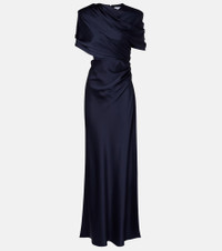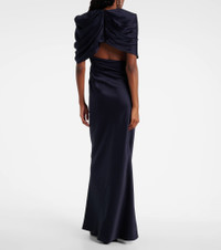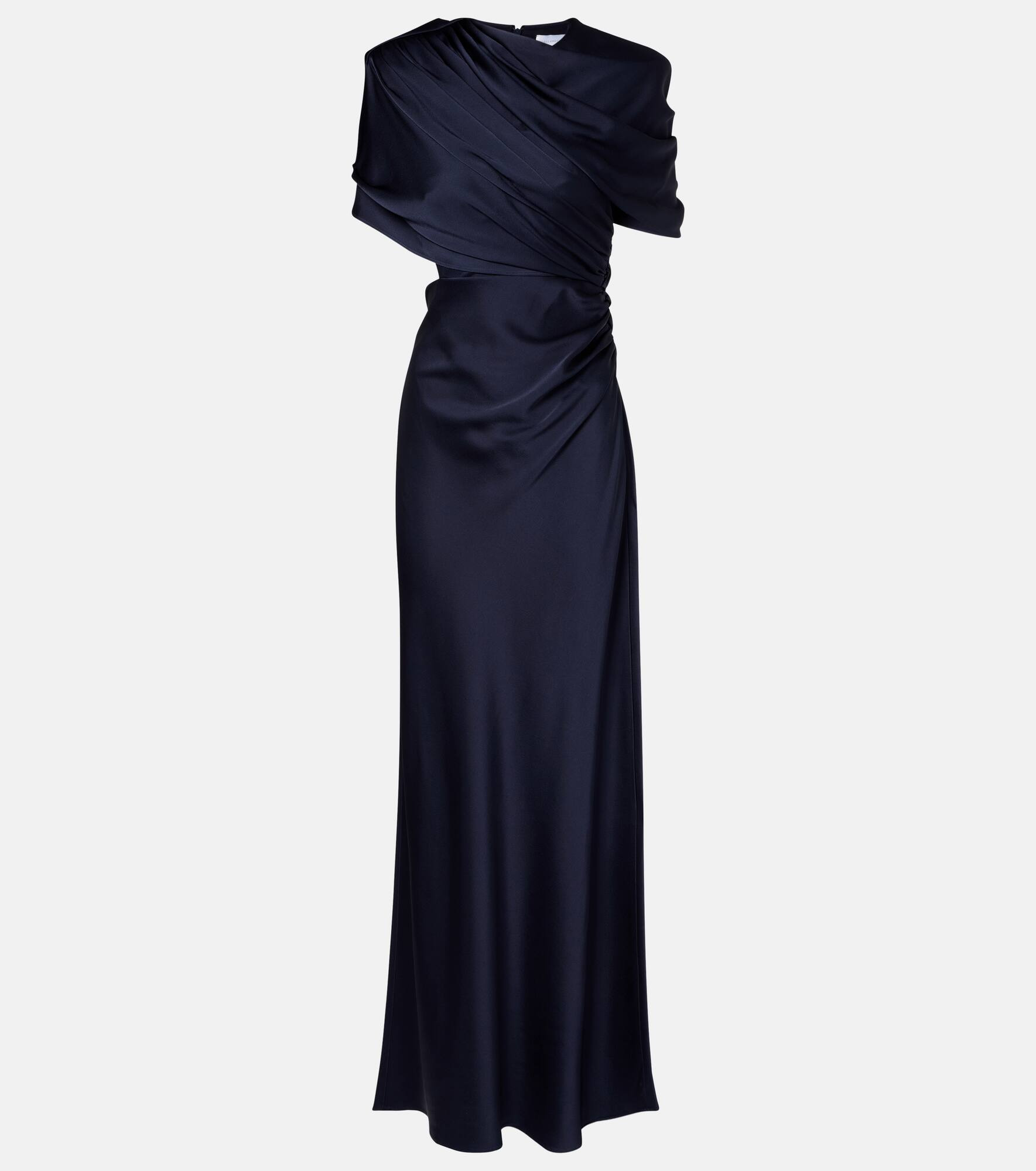 Designed to command attention, this Stella McCartney gown stuns with its majestic silhouette and alluring cutout detail. The piece features a caped bodice with a draped detail at the front, creating a figure-hugging silhouette. Product Details - Material: 73% acetate, 27% viscose - Care instructions: dry clean - Made in Romania - Designer color name: Ink - Item color: blue - Lining: 73% acetate, 27% viscose - Closure: zipped back, zipped side - Shoulder pads - Item number: P01103996 Size & Fit - True to size - Shoulder pad inserts - Low back - Cinched waist - Non-stretchy fabric - The model seen in the picture is 178cm-5'10" and wearing a size IT 40