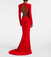 This elegant Stella McCartney crepe gown is ideal for those with minimalist tastes. The design features fitted long sleeves, a high neckline, and a flattering fit-and-flare skirt silhouette. Product Details - Material: 96% viscose, 4% elastane - Care instructions: dry clean - Made in Romania - Designer color name: Lipstick Red - Item color: red - Lining: 73% acetate, 23% silk, 4% elastane - Closure: zipped back, hook-fastening back - Shoulder pads - Fully lined - Includes: garment bag - Item number: P01103997 Size & Fit - True to size - Shoulder pad inserts - Low back - Cinched waist - Non-stretchy fabric - The model seen in the picture is 178cm-5'10" and wearing a size IT 40