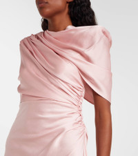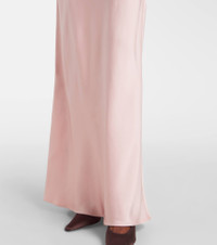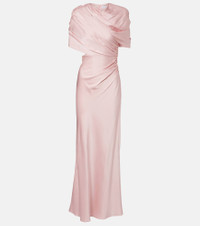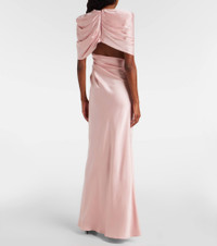 This gown from Stella McCartney has an elegant design that emphasizes the flowy drape of its satin fabrication. The piece has a sophisticated wrapped top silhouette. Product Details - Material: 73% acetate, 27% viscose - Care instructions: dry clean - Made in Romania - Designer color name: Petal Rose - Item color: pink - Lining: 73% acetate, 27% viscose - Shoulder pads - Closure: zipped back, zipped side - Includes: garment bag - Item number: P01103995 Size & Fit - True to size - Shoulder pad inserts - Low back - Cinched waist - Non-stretchy fabric - The model seen in the picture is 178cm-5'10" and wearing a size IT 40