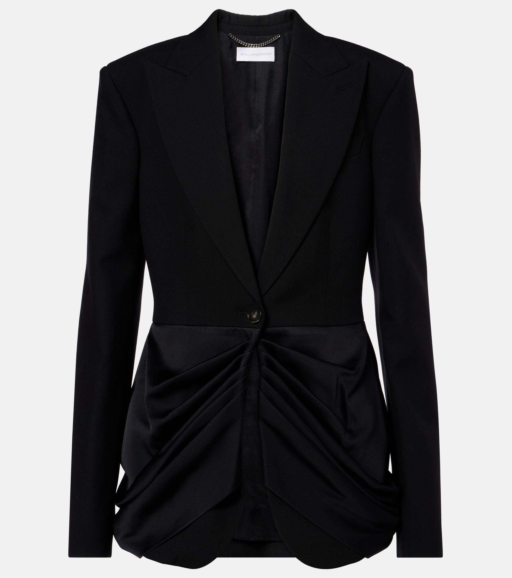 Rooted in her Savile Row training, Stella McCartney’s tailored styles are a timeless investment. This single-breasted blazer is made from pure wool and has draped satin trims starting at the waist. Product Details - Material: 100% wool - Care instructions: dry clean - Made in Italy - Designer color name: Black - Item color: black - Material II: 73% acetate, 27% viscose - Lining: 52% viscose, 48% cotton - Sleeve lining: 100% viscose - Peak lapel - Closure: single-breasted (one button) - Shoulder pads - Pockets: ticket pocket - Cuff: four buttons - Fully lined - Item number: P01052119 Size & Fit - True to size - Shoulder pad inserts - Cinched waist - Non-stretchy fabric - Falls below the hip - The model seen in the picture is 178cm-5'10" and wearing a size IT 40