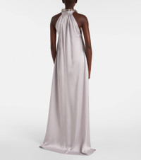 This elegant gown from Stella McCartney is made in Italy from satin. The halter silhouette is accentuated by metallic embellishments around the neck. Product Details - Material: 73% acetate, 27% viscose - Care instructions: dry clean - Made in Italy - Designer color name: Pearl Blue - Item color: blue - Closure: invisible zipper - Pockets: side slit pockets - Item number: P01052161 Size & Fit - True to size - Designed for a loose fit - Non-stretchy fabric - The model seen in the picture is 178cm-5'10" and wearing a size IT 40