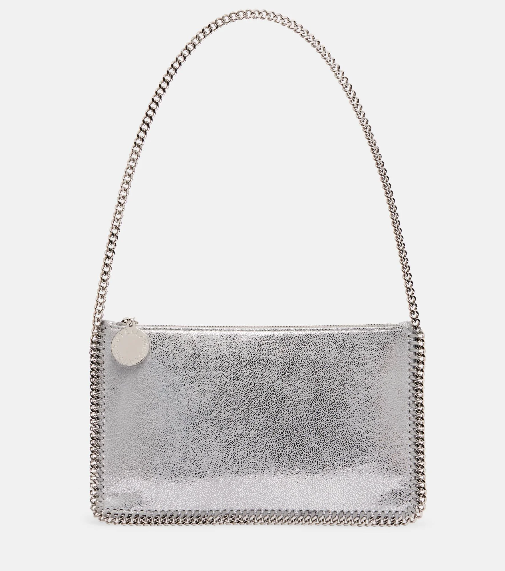 A Stella McCartney signature, this Falabella shoulder bag is presented in a metallic finish. The Mini-sized design features a compact silhouette, complemented by a silver-toned chain strap which borders the bag's edges. Product Details - Material: fabric - Lining: fabric, synthetic material - Made in Italy - Designer color name: Silver - Item color: silver - Hardware color: silver - Chain shoulder strap - Internal details: single compartment - Closure: zipped top - Includes: box - Item number: P01121695 Size & Fit - Height 14cm-5.5" - Width 24cm-9.5" - Chain length 53cm-21"