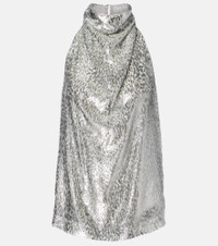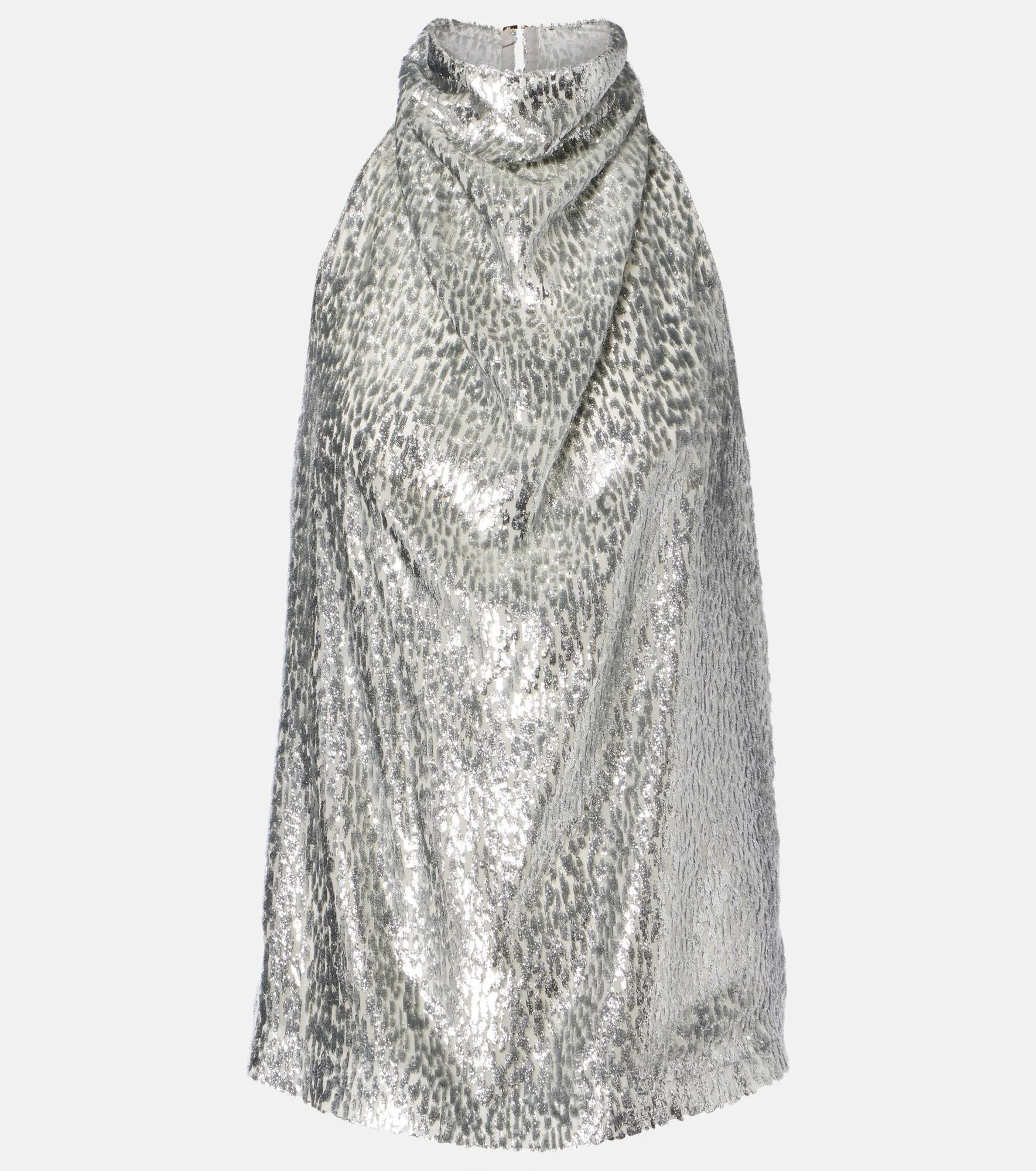 Destined for festivities and special occasions, this top from Stella McCartney delivers shimmer and sophistication. Made from lame velvet with an animal-inspired motif, the style features a draped halter neckline. Product Details - Material: 68% metallic fibres, 32% silk - Care instructions: dry clean - Made in Italy - Color: silver - Designer color name: Silver - Item color: silver - Details: 100% zamak - Hardware color: gold - Collar: mockneck - Item number: P01132587 Size & Fit - True to size - Low back - Straight fit - Non-stretchy fabric - Falls below the hip - The model seen in the picture is 178cm-5'10" and wearing a size IT 40