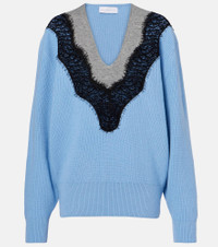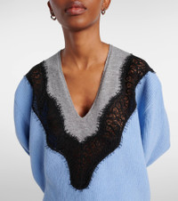 This ribbed-knit sweater by Stella McCartney is crafted from soft virgin wool into a loose silhouette. A V-neckline trimmed with contrasting lace adds a delicate touch, nodding to the brand's signature lingerie influences. Product Details - Material: 100% virgin wool - Care instructions: dry clean - Made in Italy - Designer color name: Sky Blue - Item color: blue, gray, black - Details: 100% virgin wool - Trim: 100% virgin wool - Insert: 59% viscose, 32% cotton, 9% polyamide - Collar: V-neck - Cuff: ribbed - Hem: ribbed - Item number: P01052214 Size & Fit - True to size - Dropped shoulders - Oversized - Stretchy fabric - Falls below the hip - The model seen in the picture is 178cm-5'10" and wearing a size XS