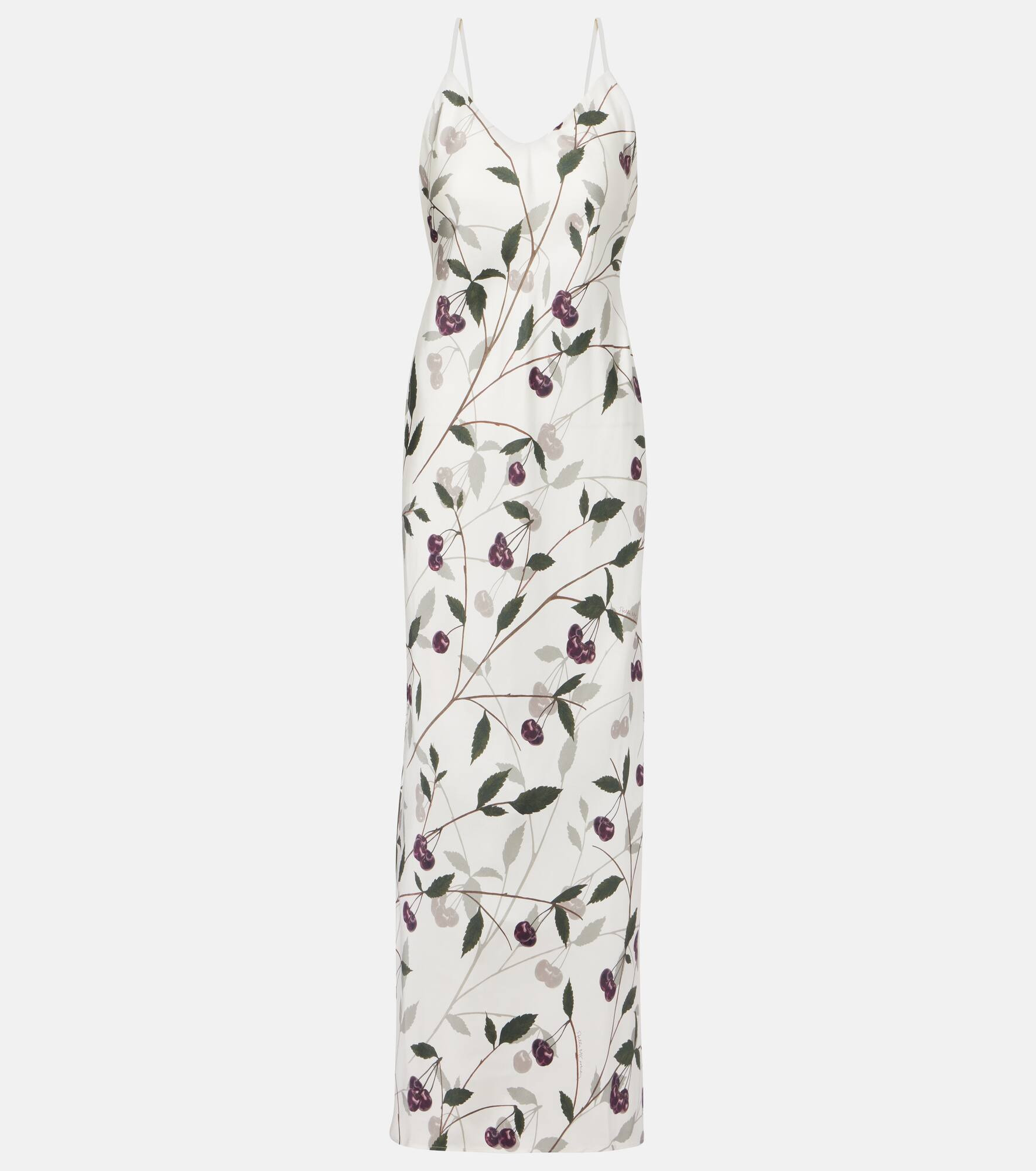 Crafted in Italy from silk, this Stella McCartney maxi dress showcases cherry motifs that lend a romantic, charming flair. This design features a V-neckline, adjustable shoulder straps, and a flattering sleeveless silhouette. Product Details - Material: 100% silk - Care instructions: dry clean - Made in Romania - Designer color name: Cream - Item color: white, multicolor - Adjustable shoulder straps - Closure: zipped back - Long vent - Item number: P01046690 Size & Fit - True to size - Low back - Cinched waist - Non-stretchy fabric - slit length 60,0cm-23.5" - The model seen in the picture is 178cm-5'10" and wearing a size IT 40