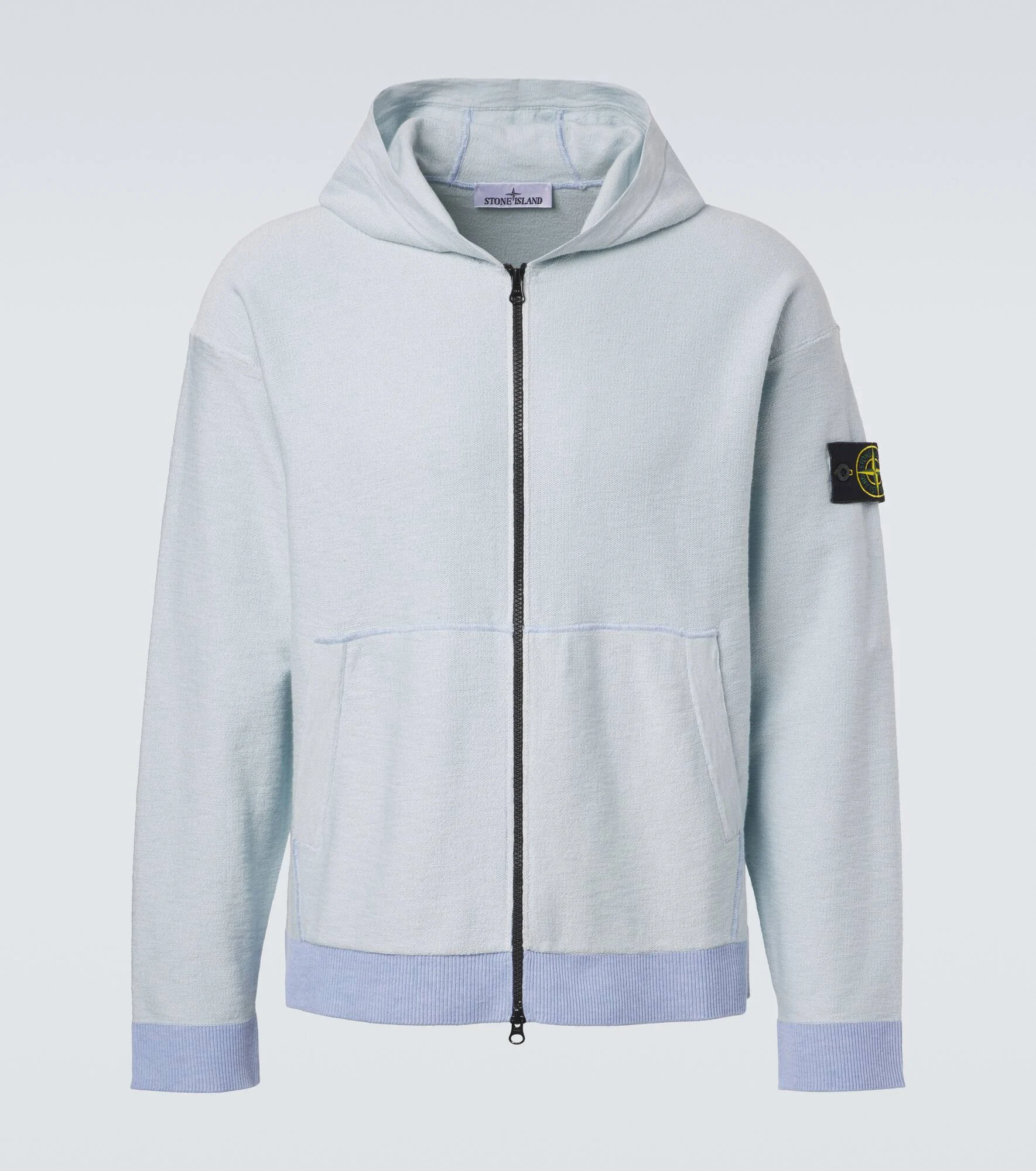 Build your everyday ensembles around distinctive staples, such as this hoodie from Stone Island, crafted from a blue cotton blend. This piece features the Compass badge on the sleeve, a symbol of the brand's love for the sea and dedication to innovation. Product Details - Material: 78% cotton, 22% polyamide - Care instructions: hand wash - Made in Bulgaria - Color: blue - Designer color name: Sky Blue - Closure: two-way zipped front - Pockets: slant pockets - Cuff: ribbed - Hem: ribbed - Hood - Item number: P01143032 Size & Fit - True to size - Dropped shoulders - Straight fit - Slightly stretchy fabric - Falls to the hip - Height of model is 192cm-75.5" and wears a size L
