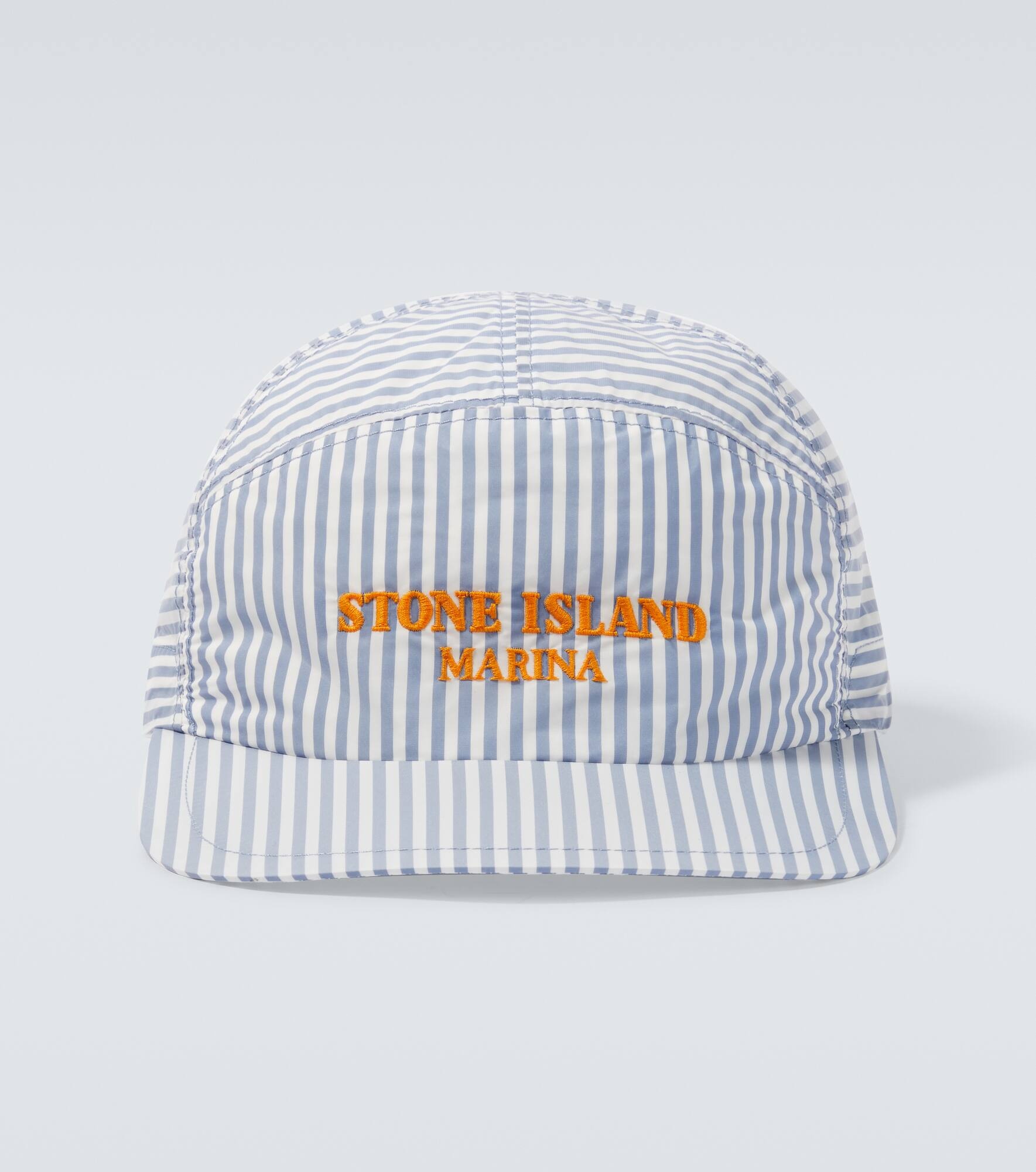 Stone Island's Marina collection showcases styles that bridge the gap between sport and leisure. This baseball cap is enriched with a classic stripe pattern and features contrasting logo embroidery at the front. Product Details - Material: 68% polyester, 32% polyamide - Care instructions: hand wash - Made in Italy - Designer color name: Bleu Marine - Item color: blue, white - Item number: P01010995 Size & Fit - Circumference size M 55cm-21.5" - Circumference size L 57cm-22.5" - Elasticated band - Circumference size XL 59cm-23" - Length of visor 7cm-3"