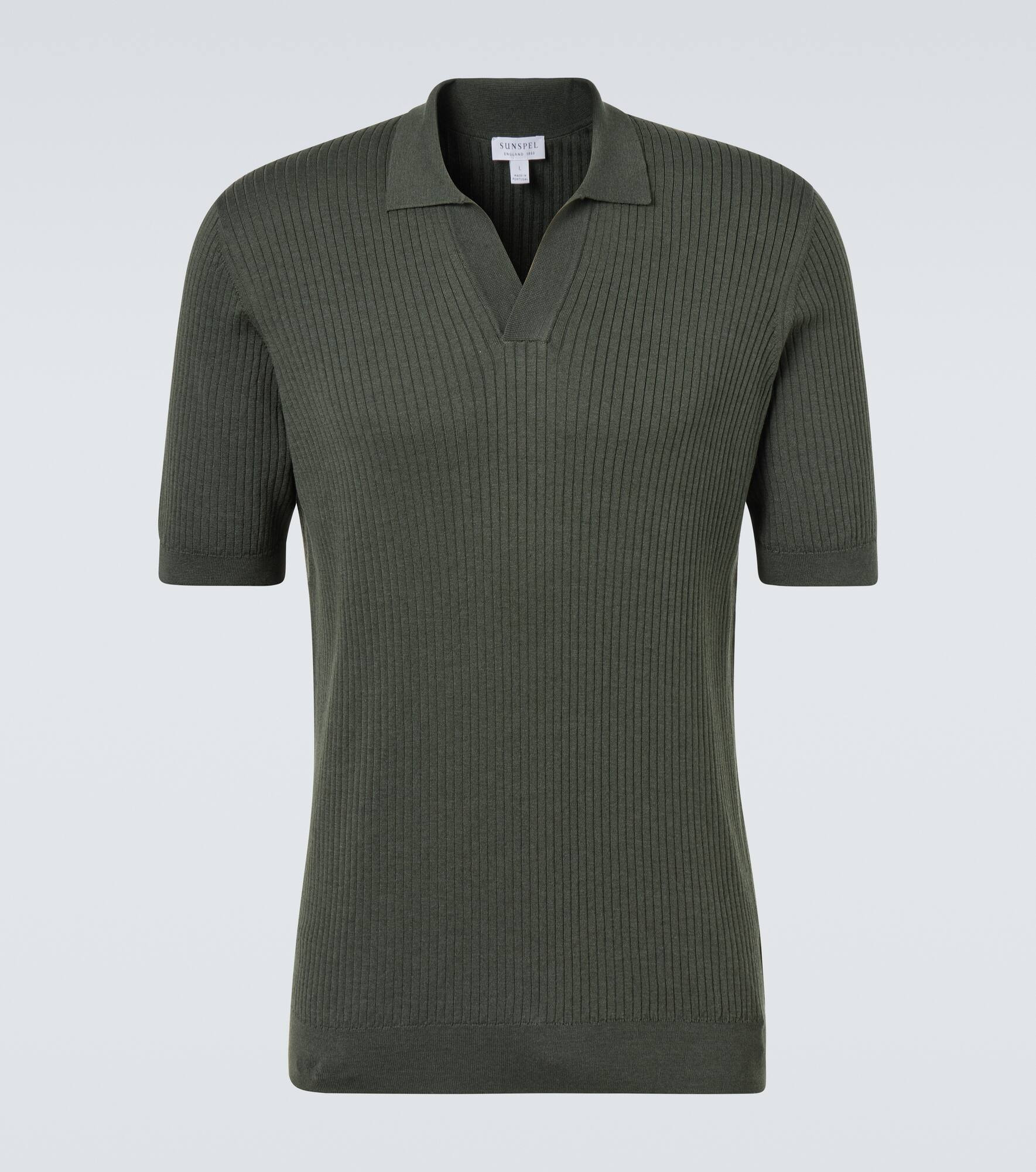 Founded in 1860, Sunspel is a British brand with a proven track record for producing timeless essentials. Crafted from silk and cotton, this ribbed-knit polo shirt features a flattering slim fit with an effortlessly sophisticated buttonless placket. Product Details - Material: 55% silk, 45% cotton - Care instructions: machine wash at 30 degrees - Made in Portugal - Designer color name: Dusk Green - Item color: green - Collar: polo collar - Sleeves: short-sleeved - Item number: P01061491 Size & Fit - True to size - Straight fit - Stretchy fabric - Falls to the hip - Height of model is 189cm-74.5" and wears a size L