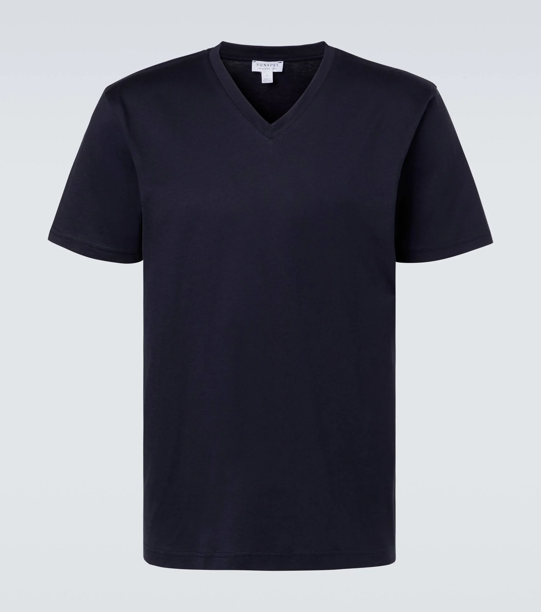 Founded in 1860, Sunspel is a British brand with a proven track record for producing timeless essentials. Made in Portugal from navy cotton jersey with a V neckline, the Riviera T-shirt's design was originally designed for the fictional English hero, James Bond in Casino Royale. Product Details - Material: 100% cotton - Care instructions: machine wash at 30 degrees - Made in Portugal - Designer color name: Navy - Item color: blue - Collar: V-neck - Item number: P01138231 Size & Fit - True to size - Straight fit - Non-stretchy fabric - Falls to the hip - Height of model is 188cm-74" and wears a size L