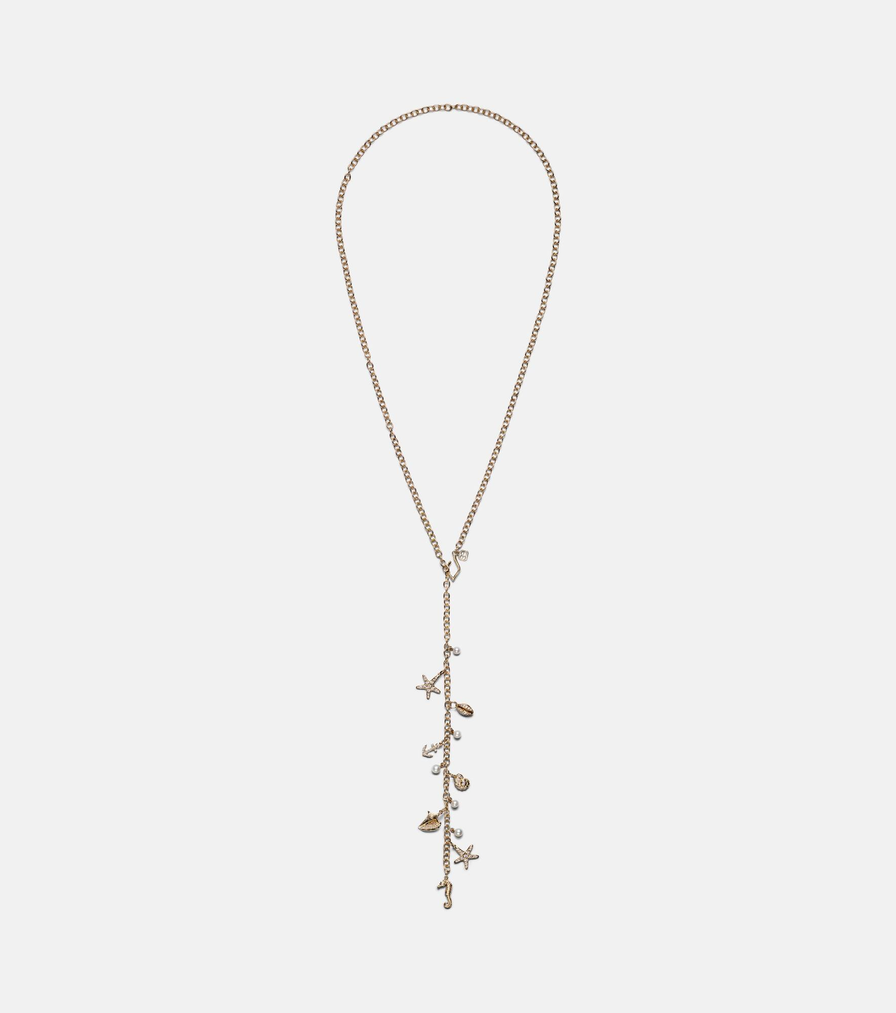 Crafted from 14kt gold, this necklace from Sydney Evan is embellished with a variety of sea-inspired charms that are embellished with diamonds. Keeping in line with the nautical theme, there are five pearls suspended in between the charms. Product Details - Material: 14kt yellow gold - Made in Thailand - Item color: gold - Stone I: 91 diamonds, pave setting, round-cut, SI2 clarity grade - Pearl I: 4.0mm, freshwater, round shape - Item number: P01071763 Size & Fit - Length when open 53,5cm-21" - Width %mm%mm-1" - Pendant length 130mm-5.1" - Pendant width 11mm-0.45"
