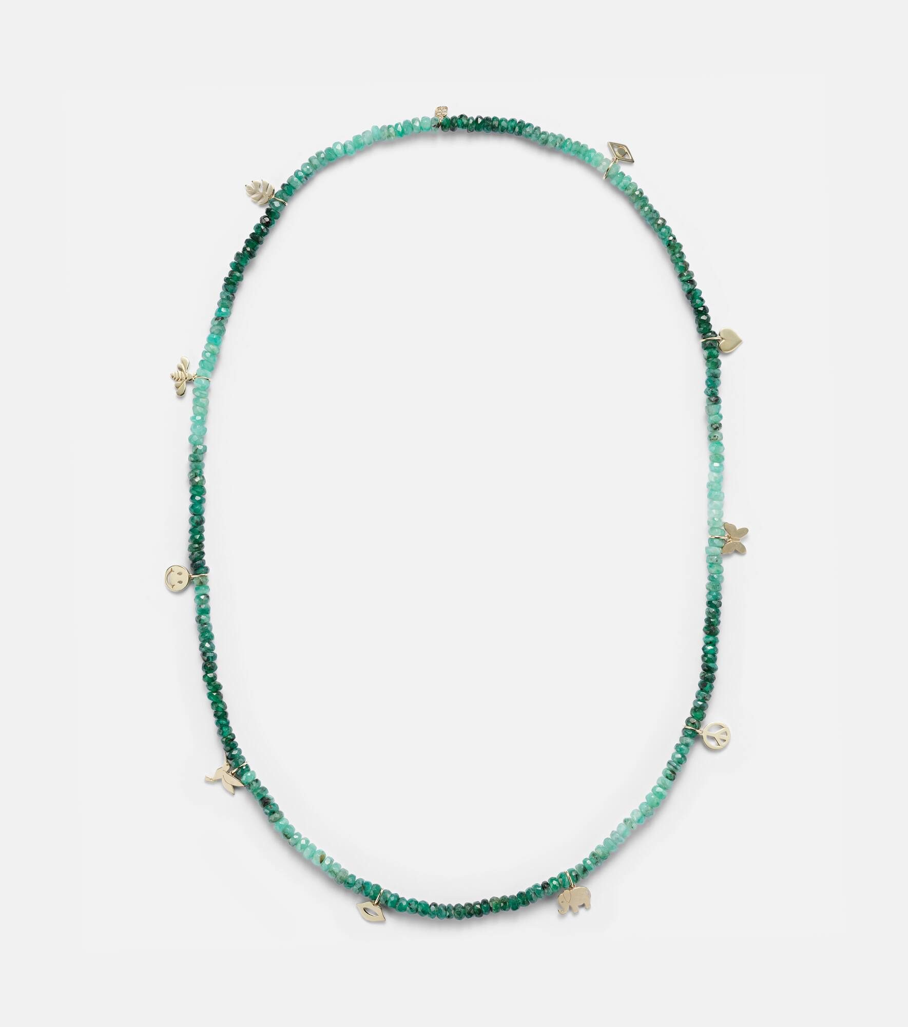 This charm necklace from Sydney Evan is a playful statement piece. The design features 4mm shaded emerald rondelle beads interspersed with ten 14K yellow gold charms, symbolizing joy, protection, and beauty. Strung on a stretch cord, it offers easy transitions from bracelet to necklace for versatile styling. Product Details - Material: 14kt yellow gold - Made in China - Item number: P00985264 Size & Fit - Width 4mm-0.15" - Circumference 54cm-21.5" - Elasticated band - Pendant length 9mm-0.35" - Pendant width 9mm-0.35"