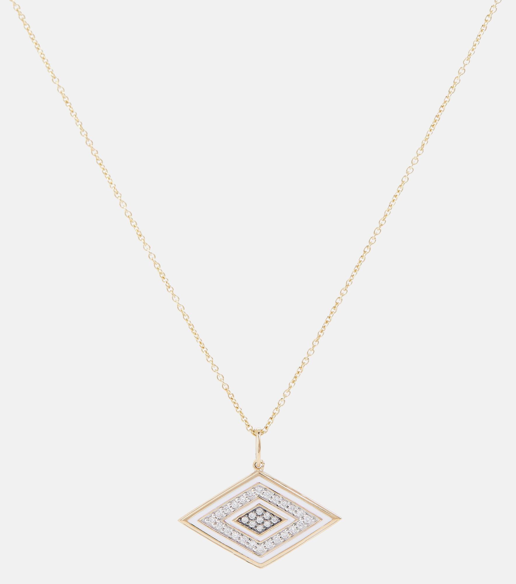 This Groovy Eye necklace from Sydney Evan features an enamel and diamond-encrusted iteration, said to protect from jealous stares. Set on a 16" yellow gold chain, it secures with a lobster clasp fastening. Product Details - Material: 14kt yellow gold - Made in Hong Kong - Stone I: diamonds - Closure: lobster-clasp fastening - Designer color name: White/Gold - Item number: P00629767 Size & Fit - Adjustable length - Length when open 46cm-18" - Pendant length 17mm-0.65" - Pendant width 21mm-0.85"