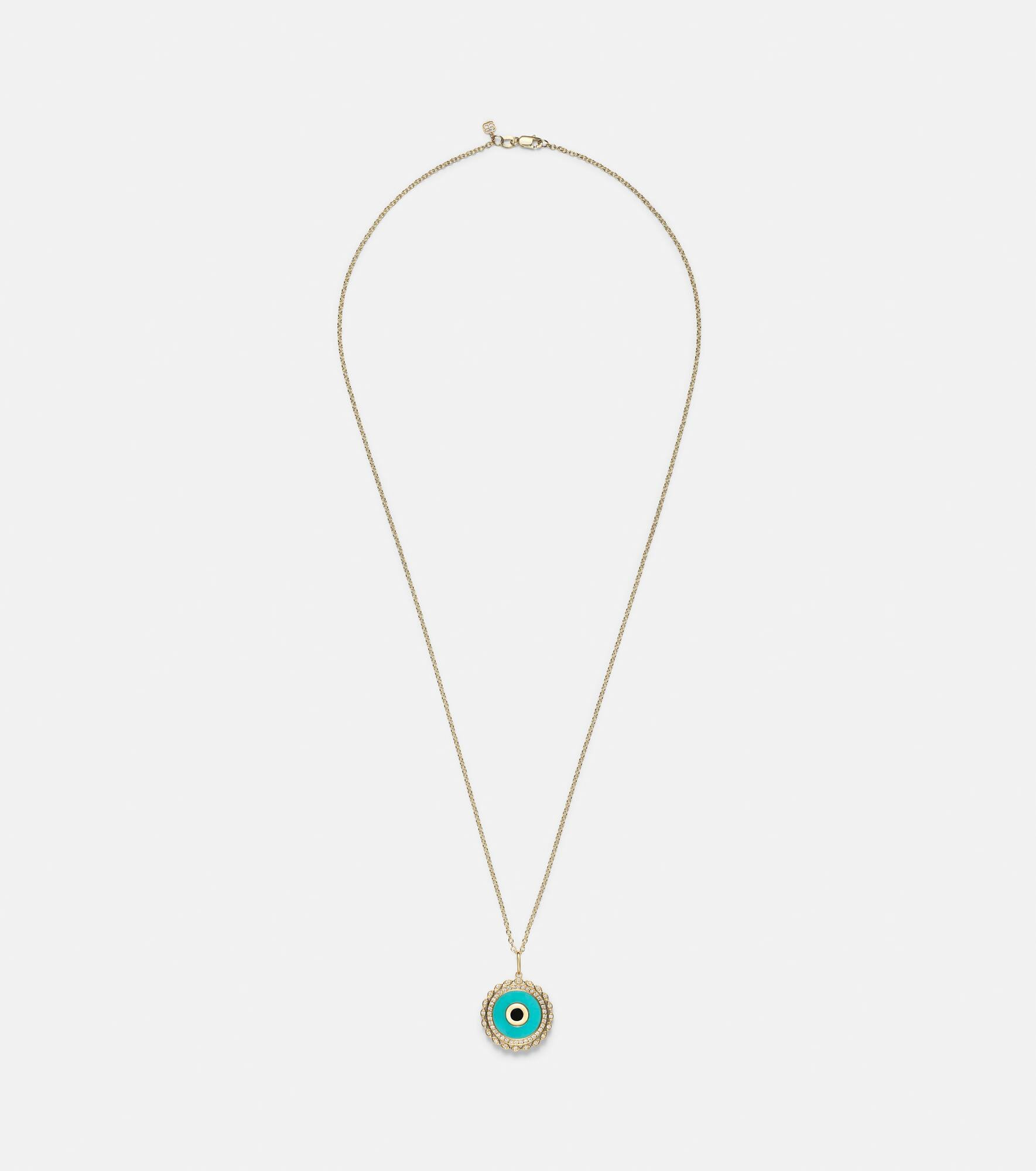 Large Evil Eye 14kt gold chain necklace with diamonds and turquoise