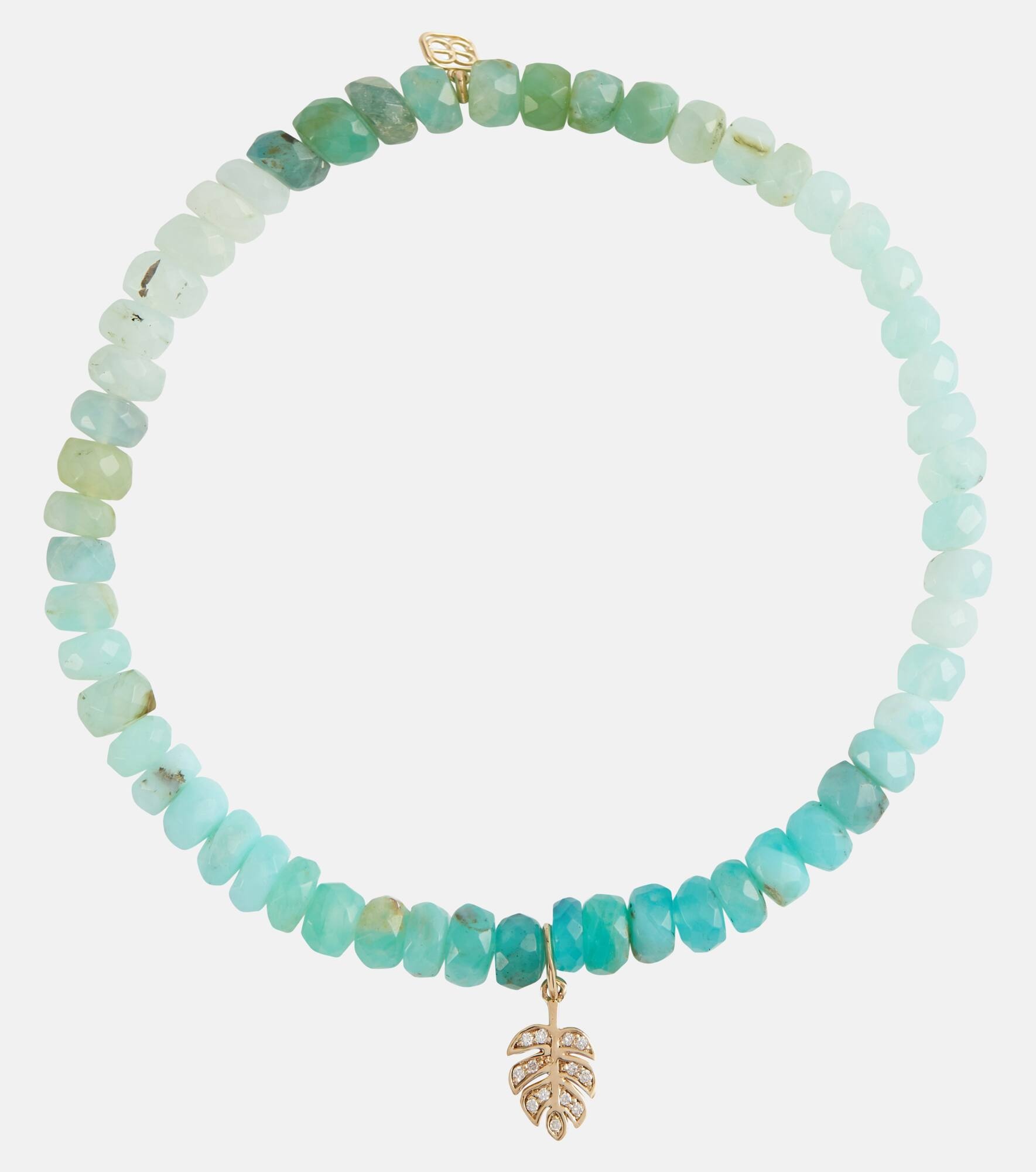 Sydney Evan brings a whimsical sensibility to your fine jewelry collection with the Tiny Monstera Leaf charm bracelet. This style is set on a stretchy cord that's threaded with multicolored Peruvian opal beads and features a 14kt gold leaf charm with diamonds. Product Details - Material: 14kt yellow gold - Made in Hong Kong - Stone I: diamonds - Designer color name: Peruvian Opal - Item number: P00618917 Size & Fit - Circumference 16cm-6.5" - Elasticated band - Pendant length 14mm-0.55" - Pendant width 6mm-0.25"