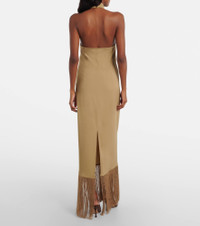Unleash your glamorous side with designs from Taller Marmo, like the Berlin gown. Made from crepe cady, this style features an elegant halter neckline and metallic fringes at the hem. Product Details - Material: 74% acetate, 22% viscose, 4% elastane - Care instructions: dry clean - Made in Italy - Designer color name: Brass - Item color: beige - Lining: 78% acetate, 22% viscose - Trim: 64% viscose, 19% polyamide, 14% nylon, 3% cotton - Closure: concealed zipped side - Short vent - Fringed hem - Item number: P01125808 Size & Fit - True to size - Low back - Cinched waist - Non-stretchy fabric - The model seen in the picture is 178cm-5'10" and wearing a size IT 40