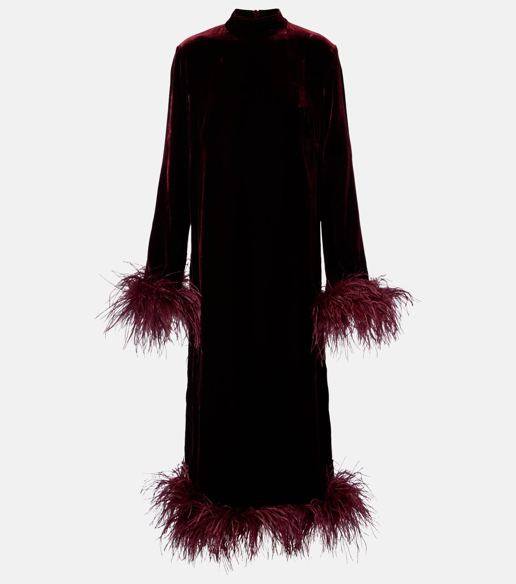 Whatever the occasion, Taller Marmo's designs promise opulence and endless glamour. The Gina Venti midi dress is made from a smooth velvet fabric with a straight silhouette and tonal feather trims. Product Details - Material: 82% viscose, 18% silk - Care instructions: dry clean - Made in Italy - Designer color name: Burgundy - Item color: burgundy - Trim: 100% ostrich feathers - Contains non-textile parts of animal origin - Closure: concealed zipped back - Item number: P01104099 Size & Fit - True to size - Designed for a loose fit - Non-stretchy fabric - The model seen in the picture is 178cm-5'10" and wearing a size IT 40