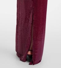 Taller Marmo's glamorous designs are exclusively made in Italy by experienced artisans. The Miami gown is decorated with all-over dazzling sequins and features a high neck and timeless column silhouette. Product Details - Material: 100% polyester - Care instructions: dry clean - Made in Italy - Designer color name: Burgundy - Item color: burgundy - Lining: 100% polyester - Lining II: 78% acetate, 22% viscose - Collar: mockneck - Closure: buttoned back - Long vent - Item number: P01104103 Size & Fit - Fits large to size - we recommend trying one size smaller - Cinched waist - Non-stretchy fabric - slit length 70cm-27.5" - The model seen in the picture is 178cm-5'10" and wearing a size IT 38