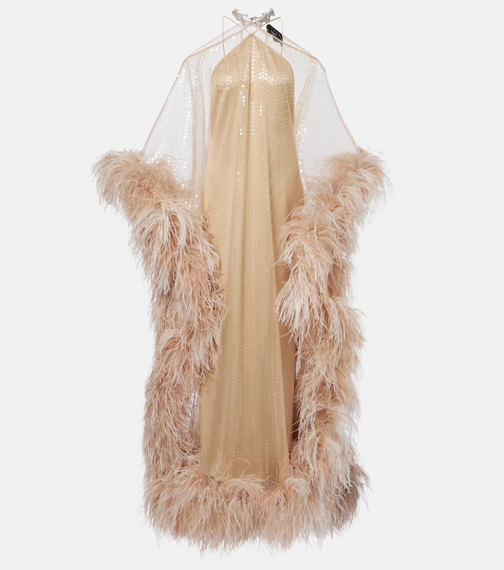 Taller Marmo's glamorous designs are exclusively made in Italy by experienced artisans. The Sza Sza Disco kaftan features tonal sequin embellishments and a plush feather trim around the hem. Product Details - Material: 67% polyester, 31% nylon, 2% elastane - Care instructions: dry clean - Made in Italy - Color: pink - Designer color name: Cipria - Trim: 100% ostrich feathers - Lining: 74% acetate, 22% viscose, 4% elastane - Item number: P01125813 Size & Fit - True to size - Low back - Semi-sheer - Designed for a loose fit - Please note: Slip dress is fitted - Non-stretchy fabric - The model seen in the picture is 178cm-5'10" and wearing a size IT 40