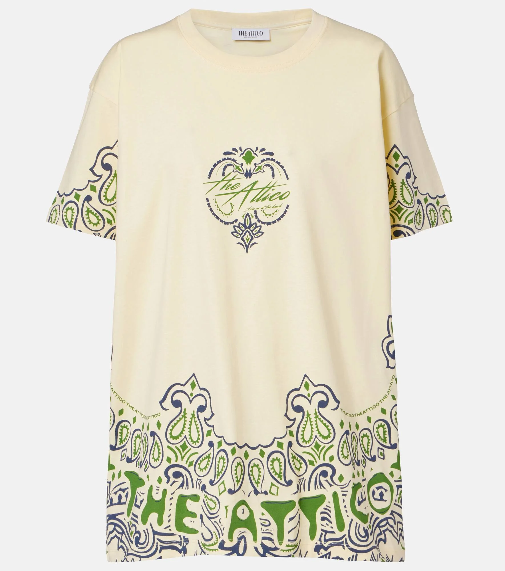 The Attico’s message is simple – it’s time to dress up. Made in Italy from cotton jersey, this T-shirt is cut to an oversized silhouette and features a bandana-inspired print. Product Details - Material: 100% cotton - Care instructions: machine wash at 30 degrees - Made in Italy - Color: yellow - Designer color name: Multicolor V1 - Item color: yellow, multicolor - Trim: 100% cotton - Collar: crewneck - Item number: P01127554 Size & Fit - True to size - Dropped shoulders - Oversized - Slightly stretchy fabric - Falls below the hip - The model seen in the picture is 178cm-5'10" and wearing a size IT 40