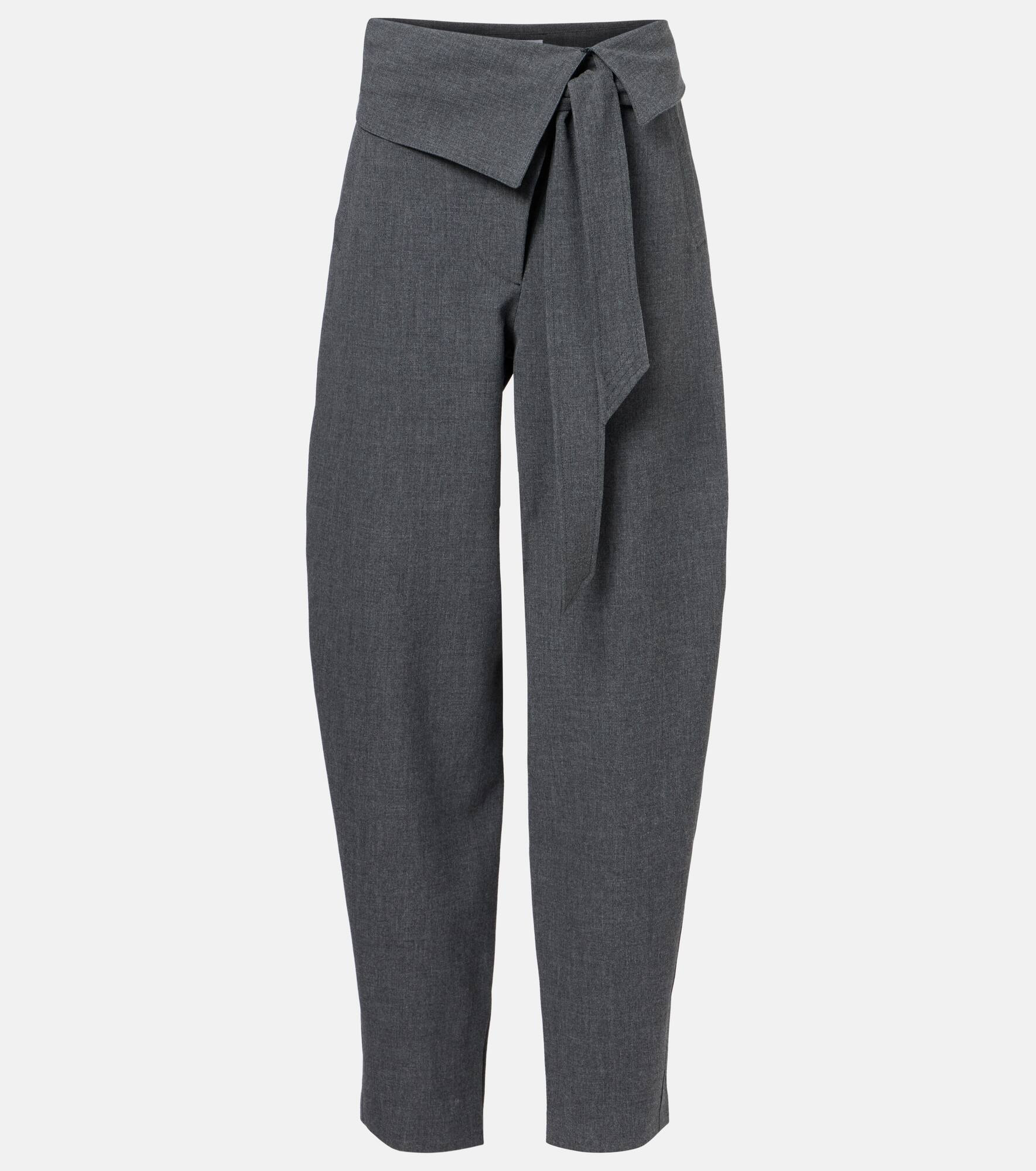 The Attico’s message is simple – it’s time to dress up. These cady balloon pants have an exaggerated silhouette topped by a foldover waistband and a tonal belt detail. Product Details - Material: 68% polyester, 29% viscose, 3% elastane - Care instructions: dry clean - Made in Italy - Designer color name: Grey - Item color: gray - Lining: 100% viscose - Closure: buttoned placket - Belt loops - Detachable belt - Pockets: slant pockets, back pockets - High-rise - Item number: P01046010 Size & Fit - Fits large to size - we recommend trying one size smaller - Adjustable at the waist - Non-stretchy fabric - Tapered leg - High-waisted - The model seen in the picture is 178cm-5'10" and wearing a size IT 38
